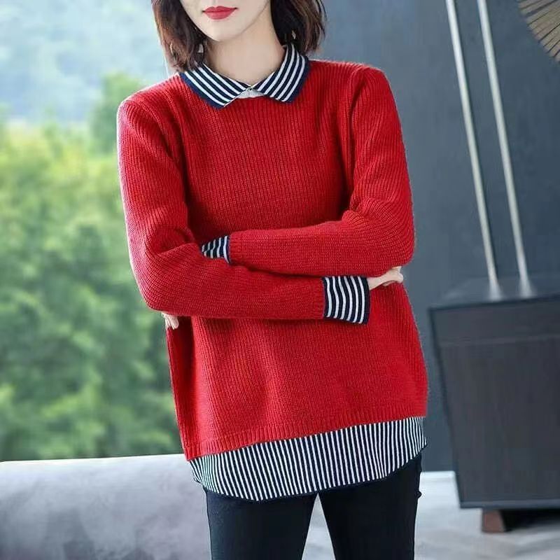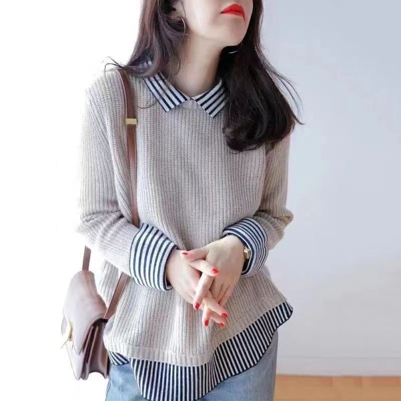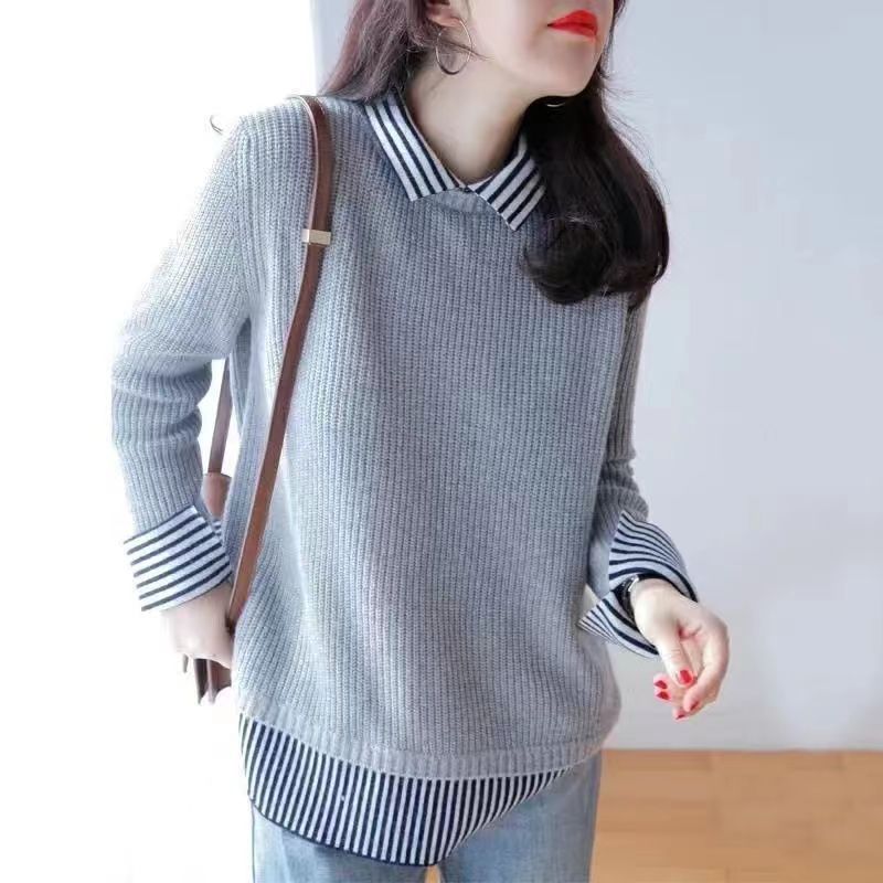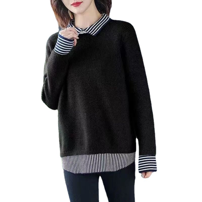 Fashionable Age-reducing Splicing Fake Two-piece Sweater For Women Autumn And Winter Loose Casual Slim Knitted Sweater Women's Tops