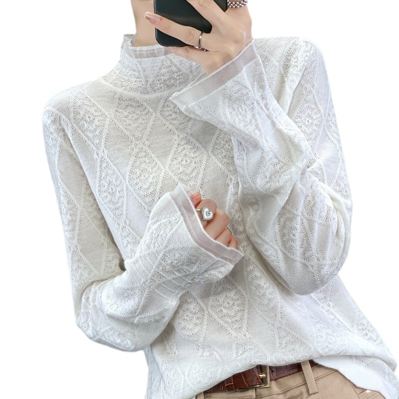 Autumn Worsted Wool Lace Bottoming Shirt For Women Loose Long-sleeved Versatile Half Turtleneck Mesh Sweater Sweater