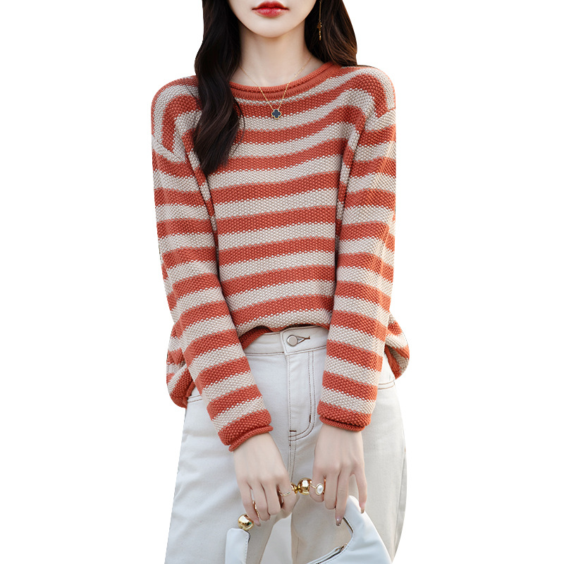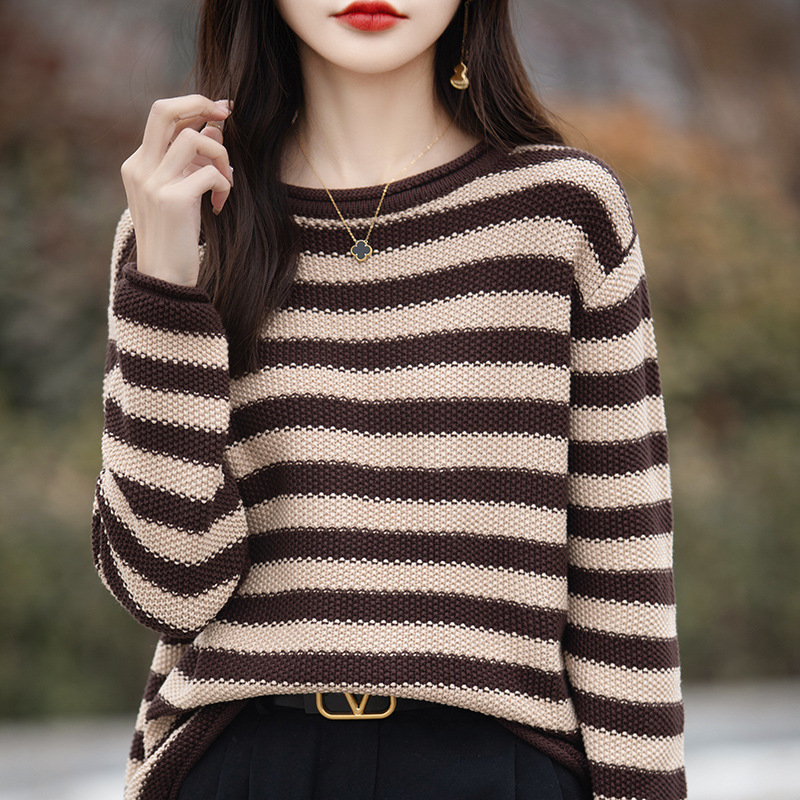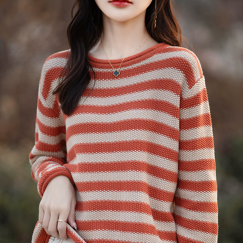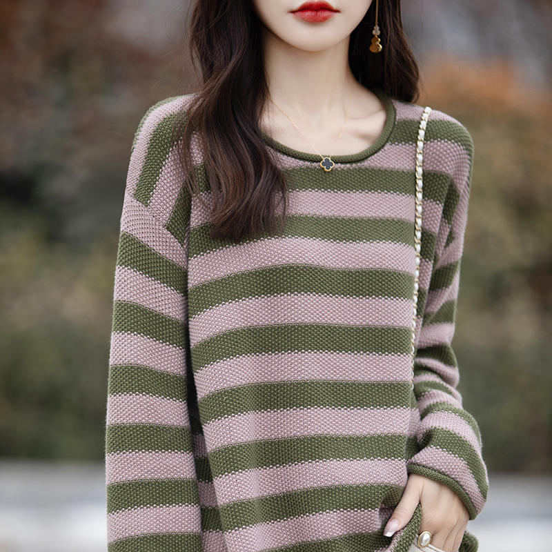 Contrast Color Round Neck Striped Cotton Sweater Women Spring Retro Art Large Size Knitted Sweater Top