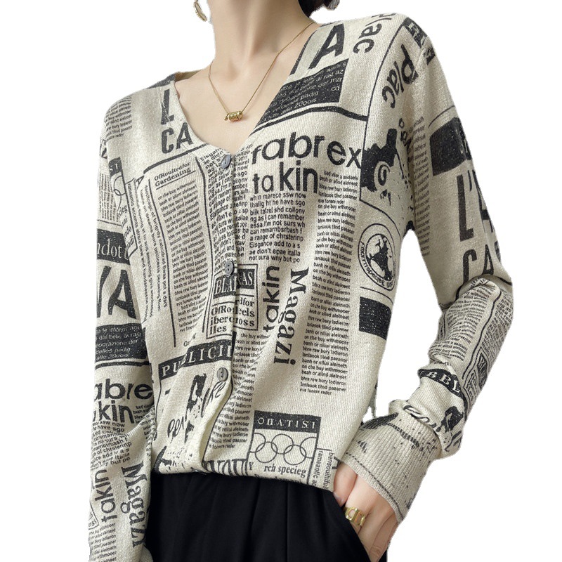 Autumn V-neck Bright Silk Wool Cardigan For Women Pictorial Style Knitwear European And American Loose Letter Jacket For Women
