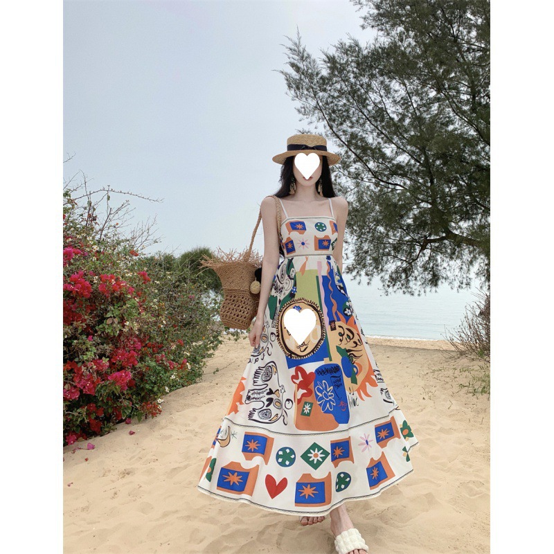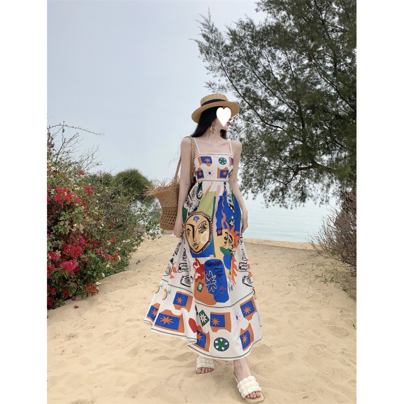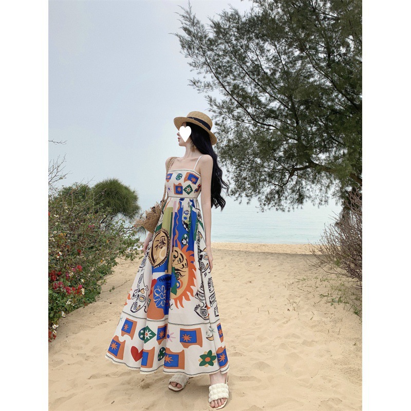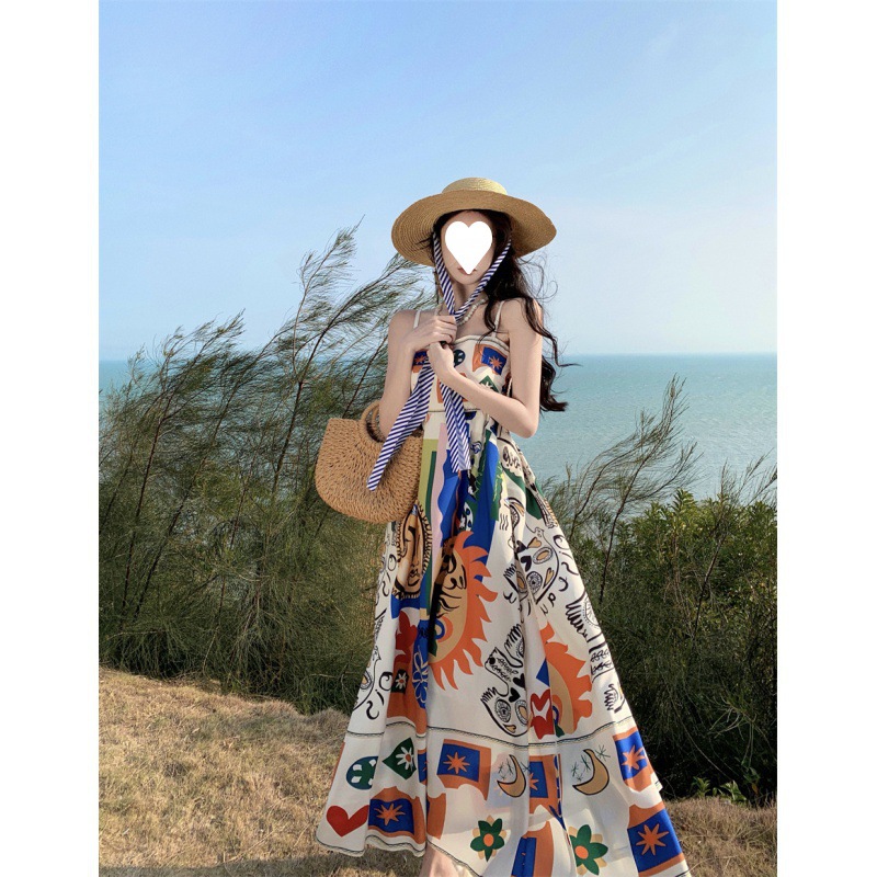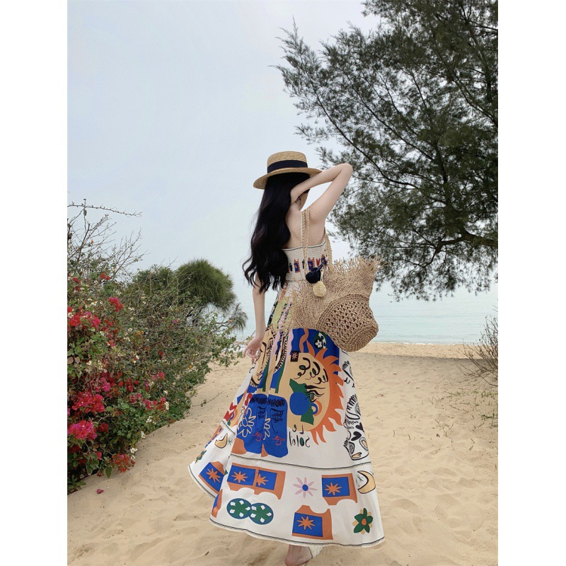 Thai Colorful Printed One-shoulder Sleeveless Beach Long Dress For Seaside Vacation Slimming Tube Top Suspender Dress For Women Summer