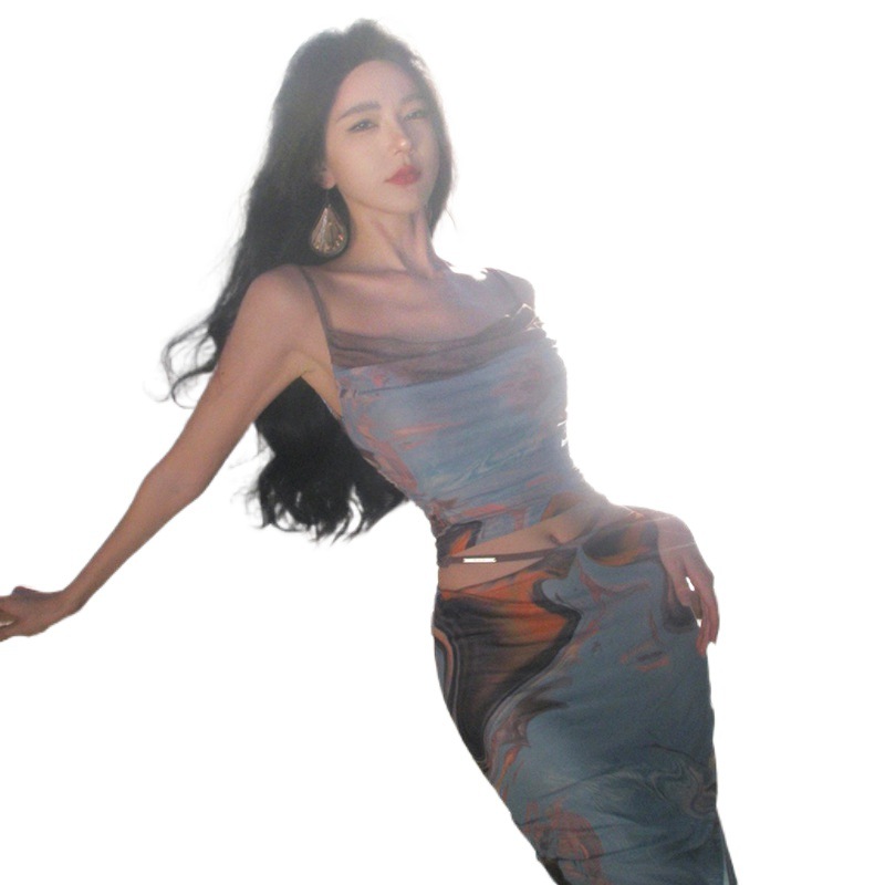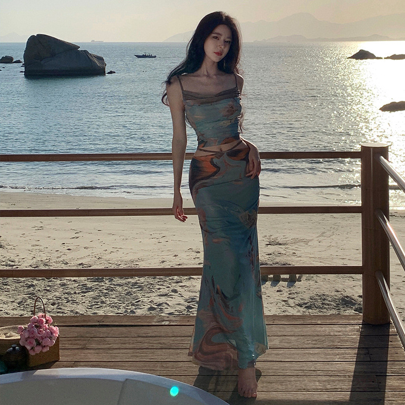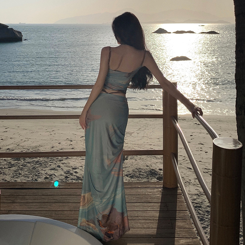 Stream Of Consciousness Impressionist Oil Painting Printed Suspender Skirt Two-piece Set Sanya Travel Vacation Suit For Women Summer