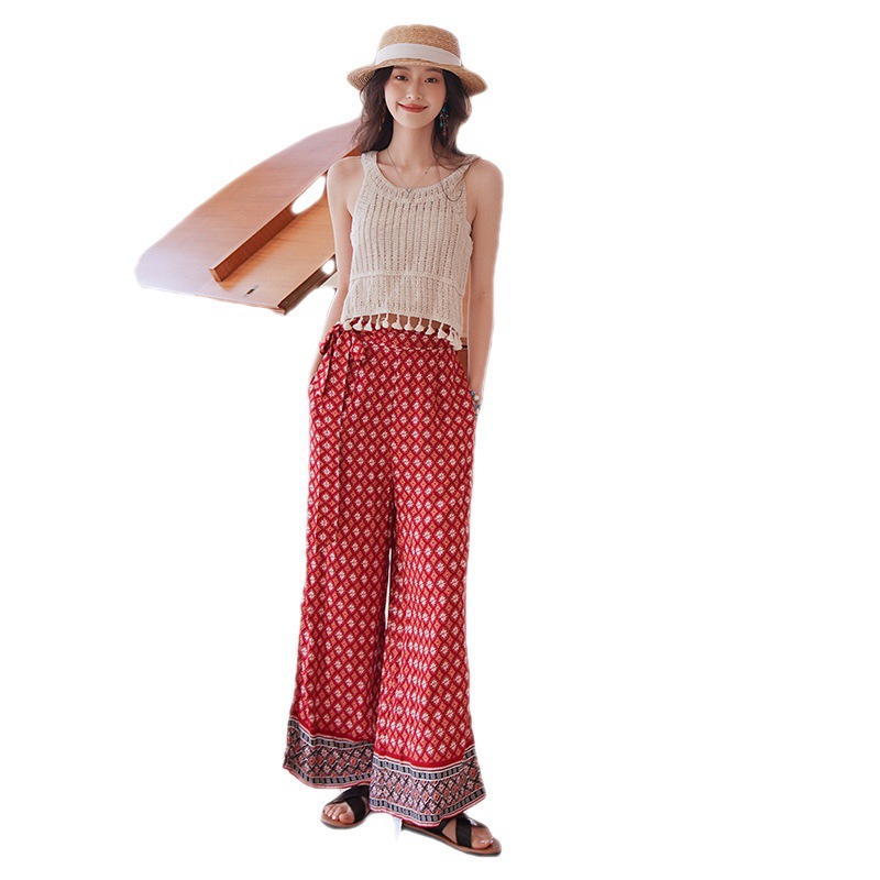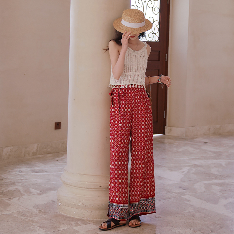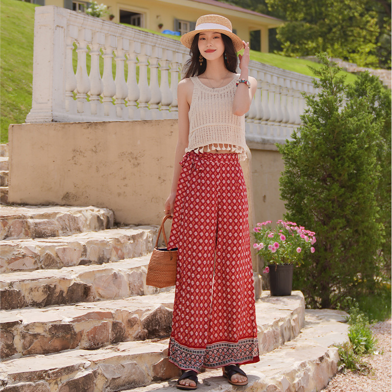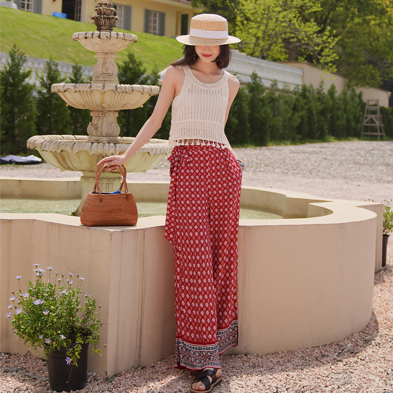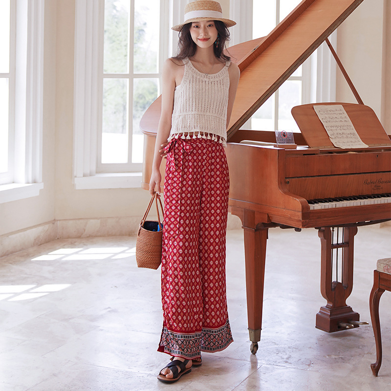 Xishuangbanna Suspender Top+Seaside Vacation Pants Suit Hollow Thailand Travel Wear Vest Wide-leg Pants