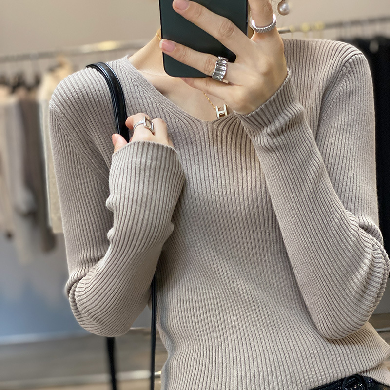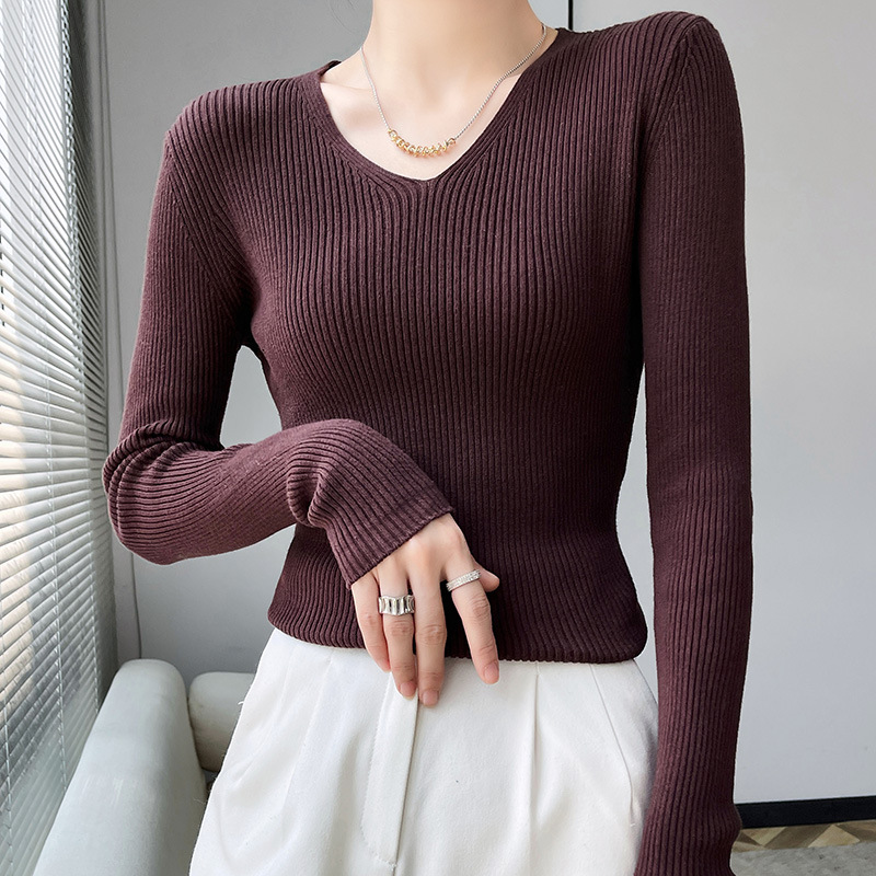 Cotton Knitted Bottoming Shirt For Women Autumn And Winter V-neck Slim Fit Striped Sweater Inner Wear Tight Long Sleeve Cotton Knitted Sweater For Women