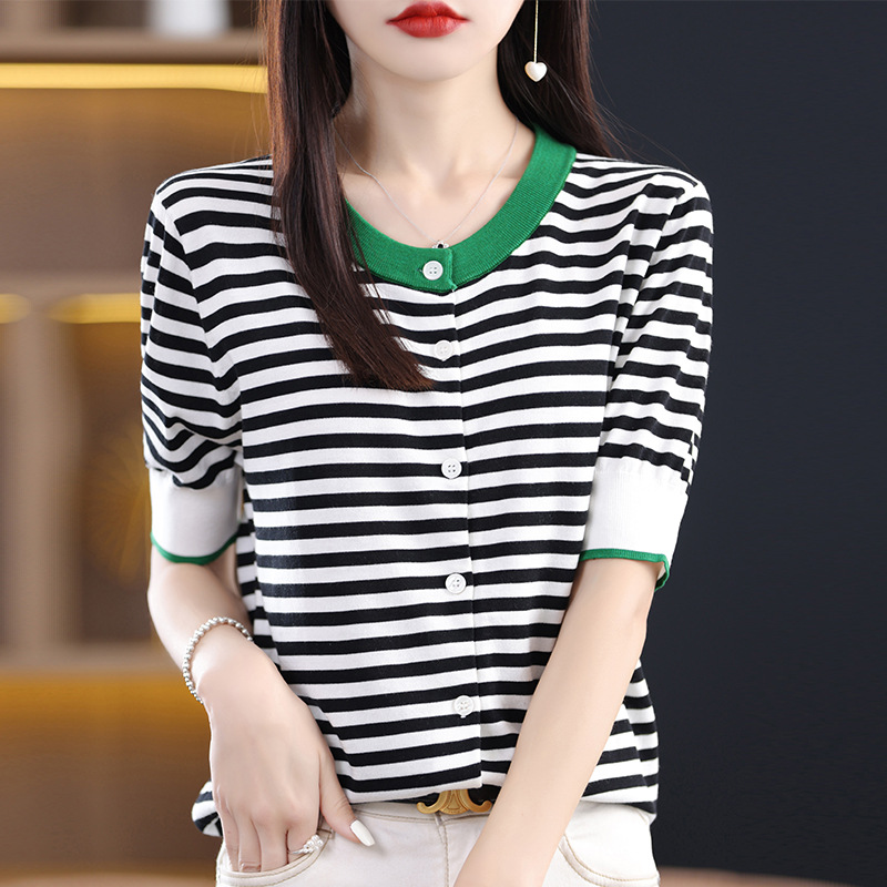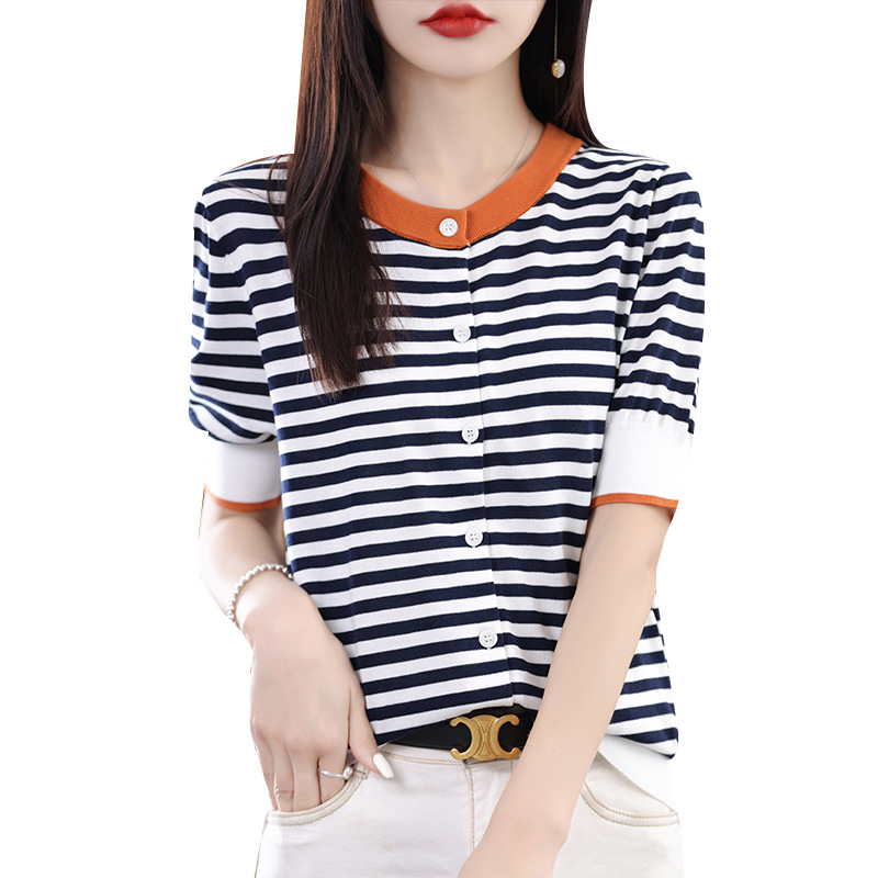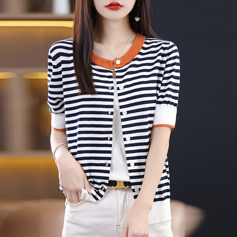 Style Small Fragrant Style Striped Contrasting Sky Silk Sweater For Women Thin Round Neck Short Sleeve Outer Cardigan Women's Top Cover