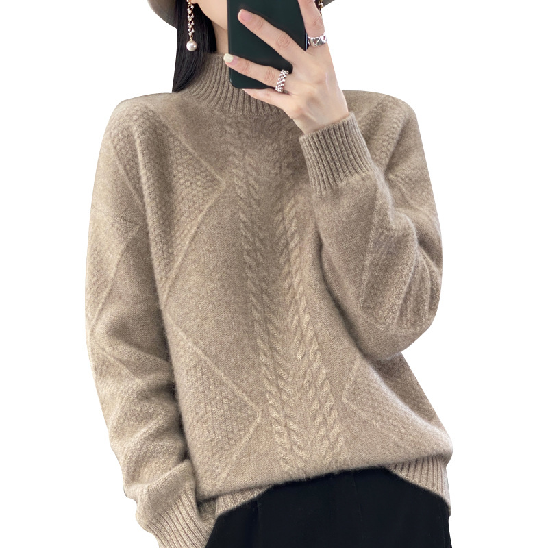 Women's Half Turtle Collar Diamond Cable Wool Bottoming Sweater Autumn And Winter Loose Lazy Style Thickened Sweater For Women
