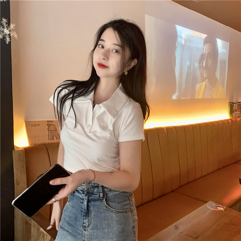 Summer Cotton POLOShirt Lapel High Waist Short Short-sleeved T-shirt Women's Clothing Age-reducing Navel Embroidered Top