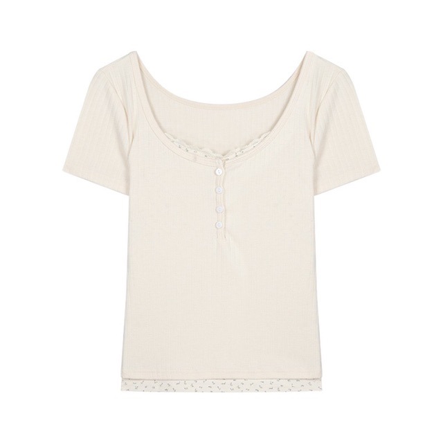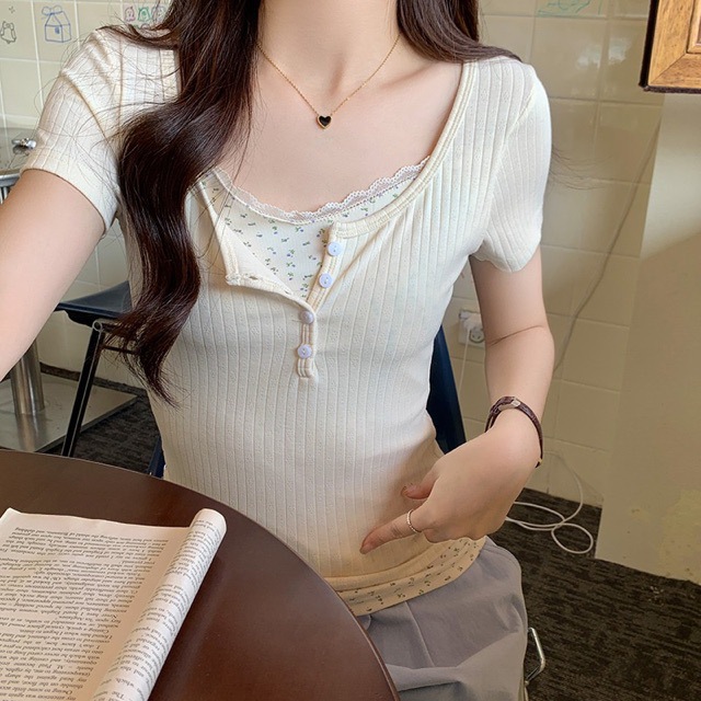 Lace-edge Floral Short-sleeved T-shirt For Women,Fake Two-piece Stitching,Straight Shoulder Top,Pure Desire Style,Hot Girl,Slim Fit,Short Inner Wear
