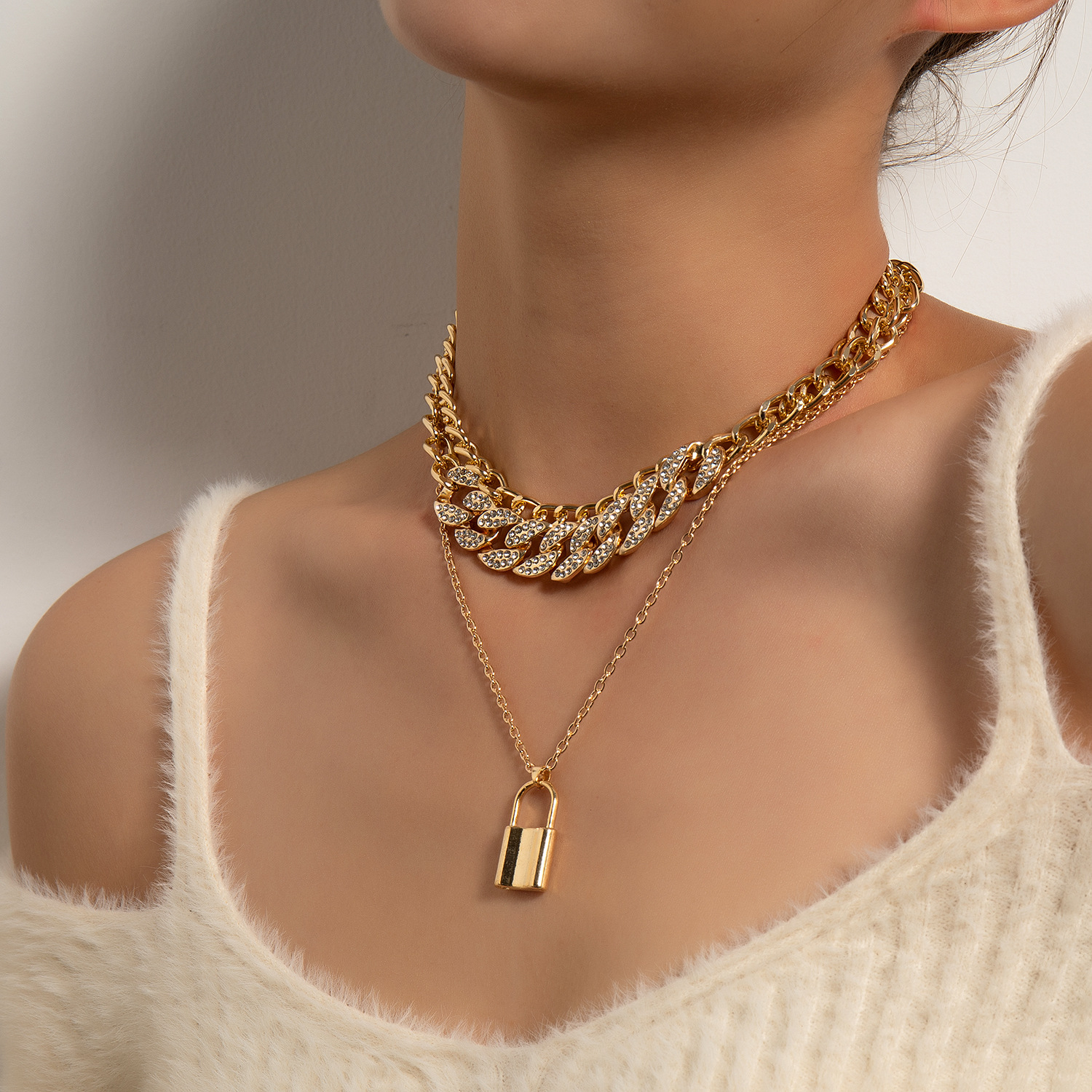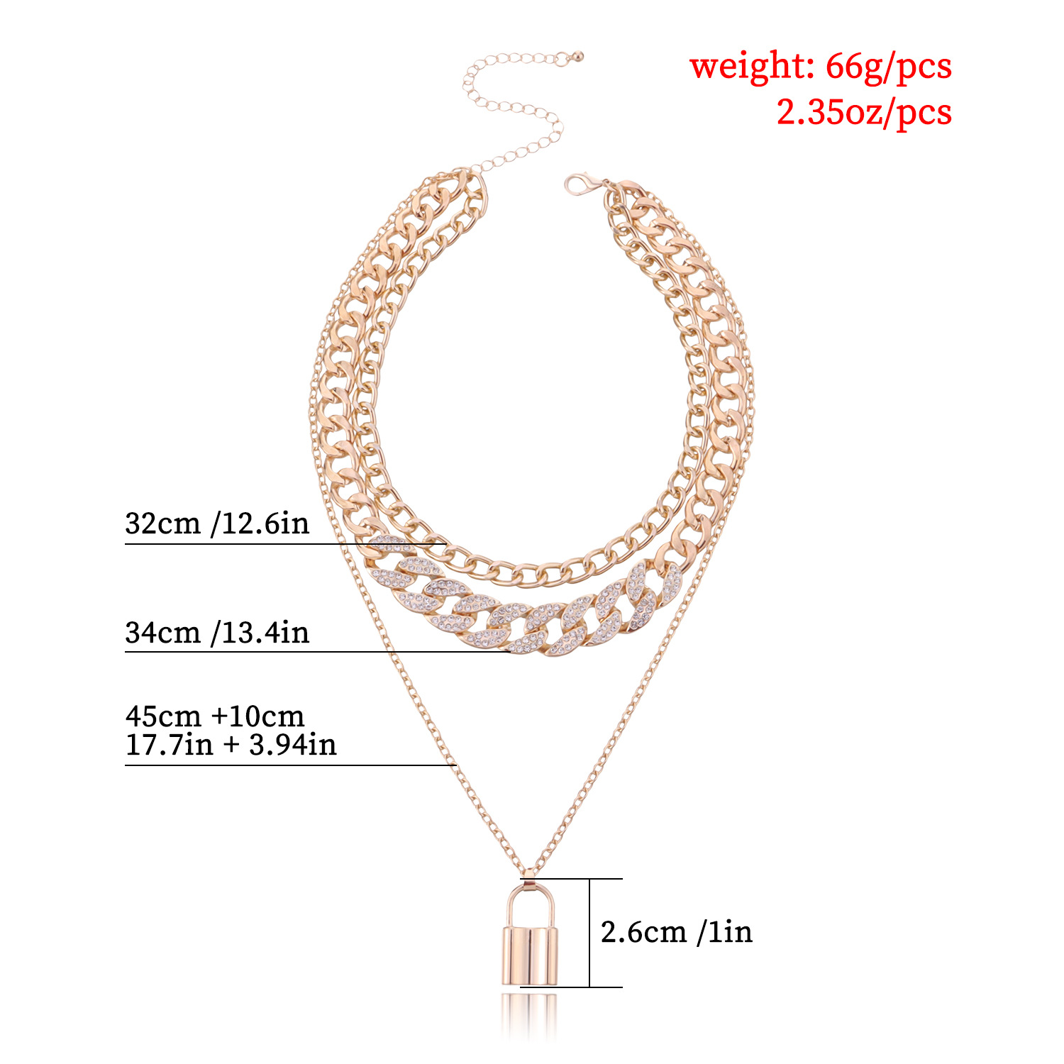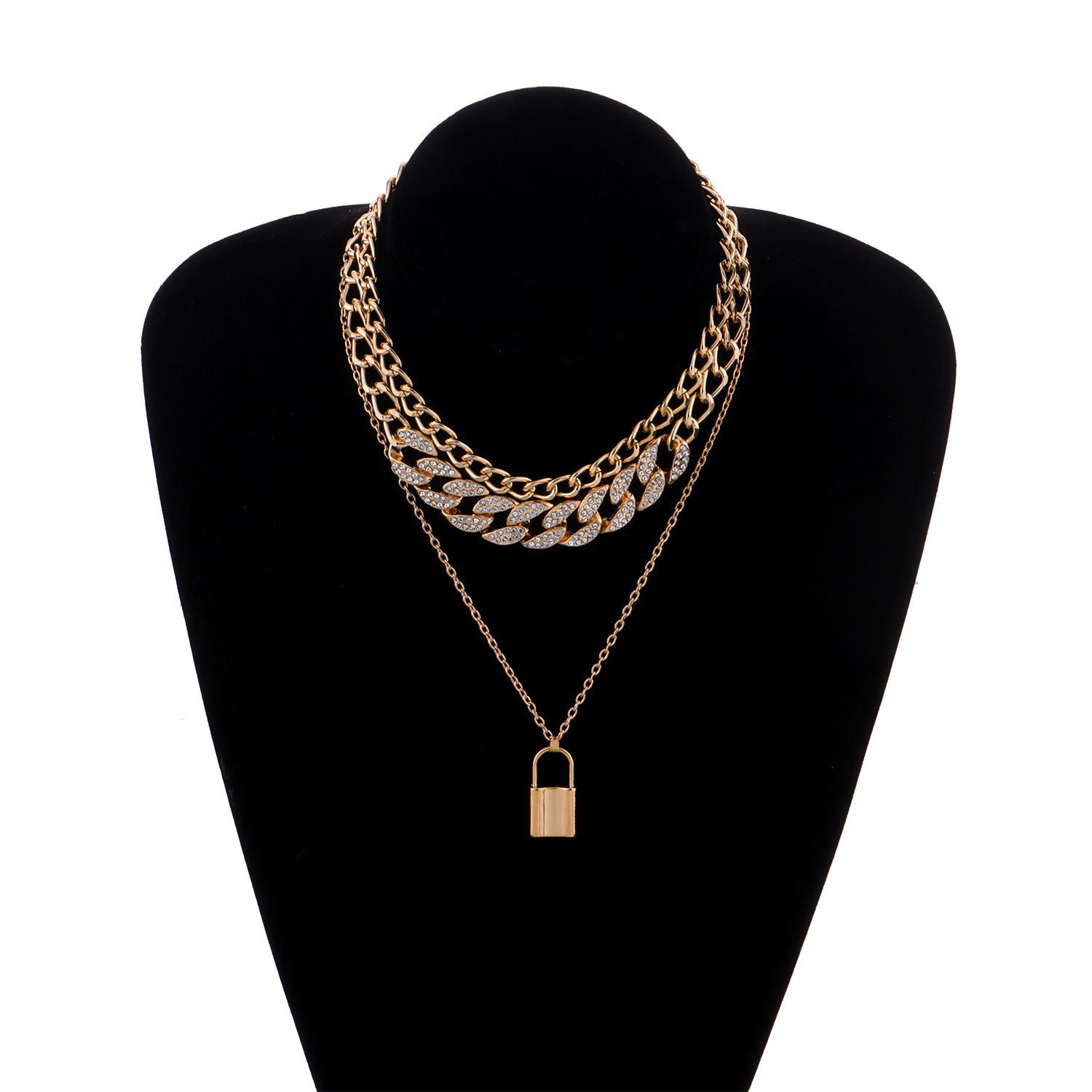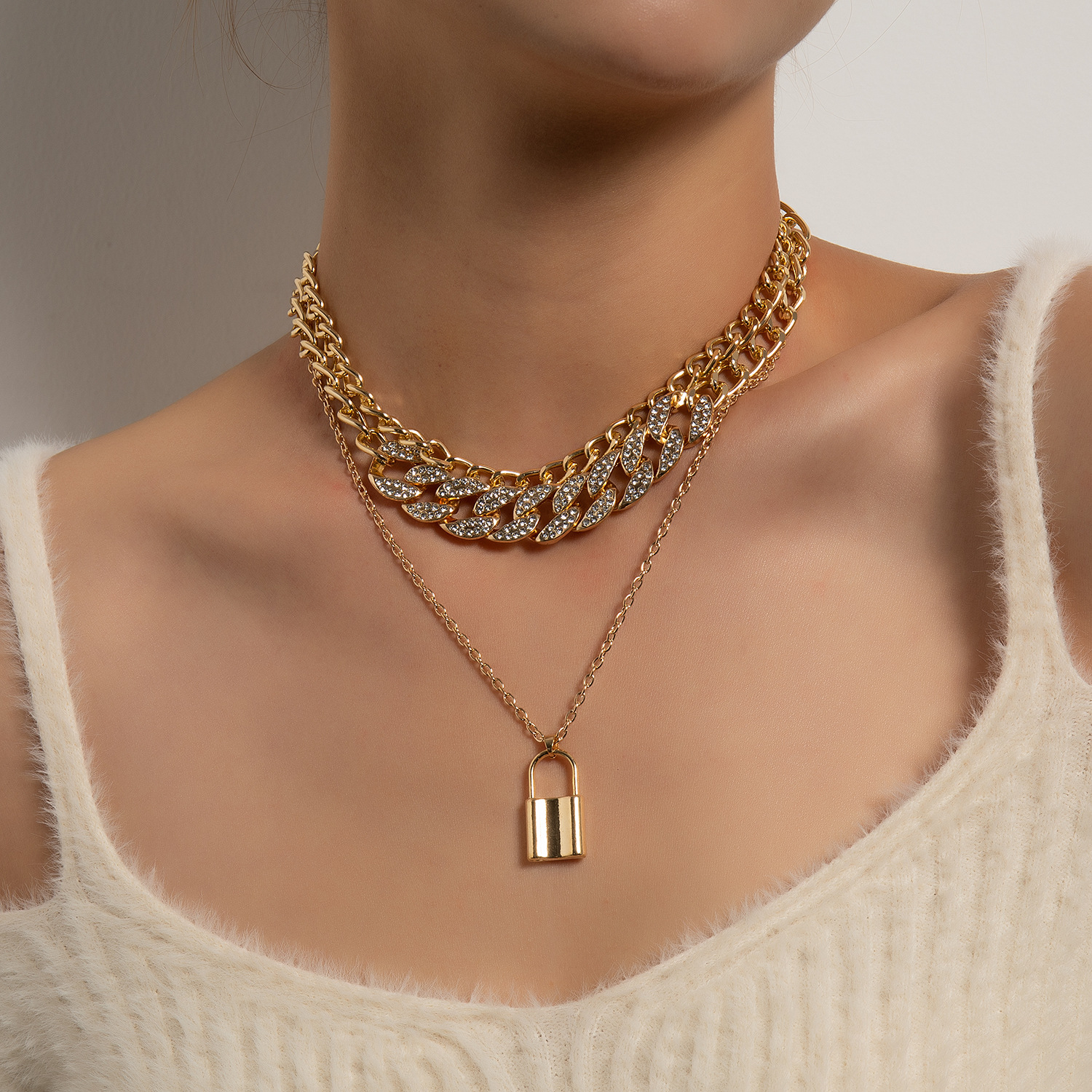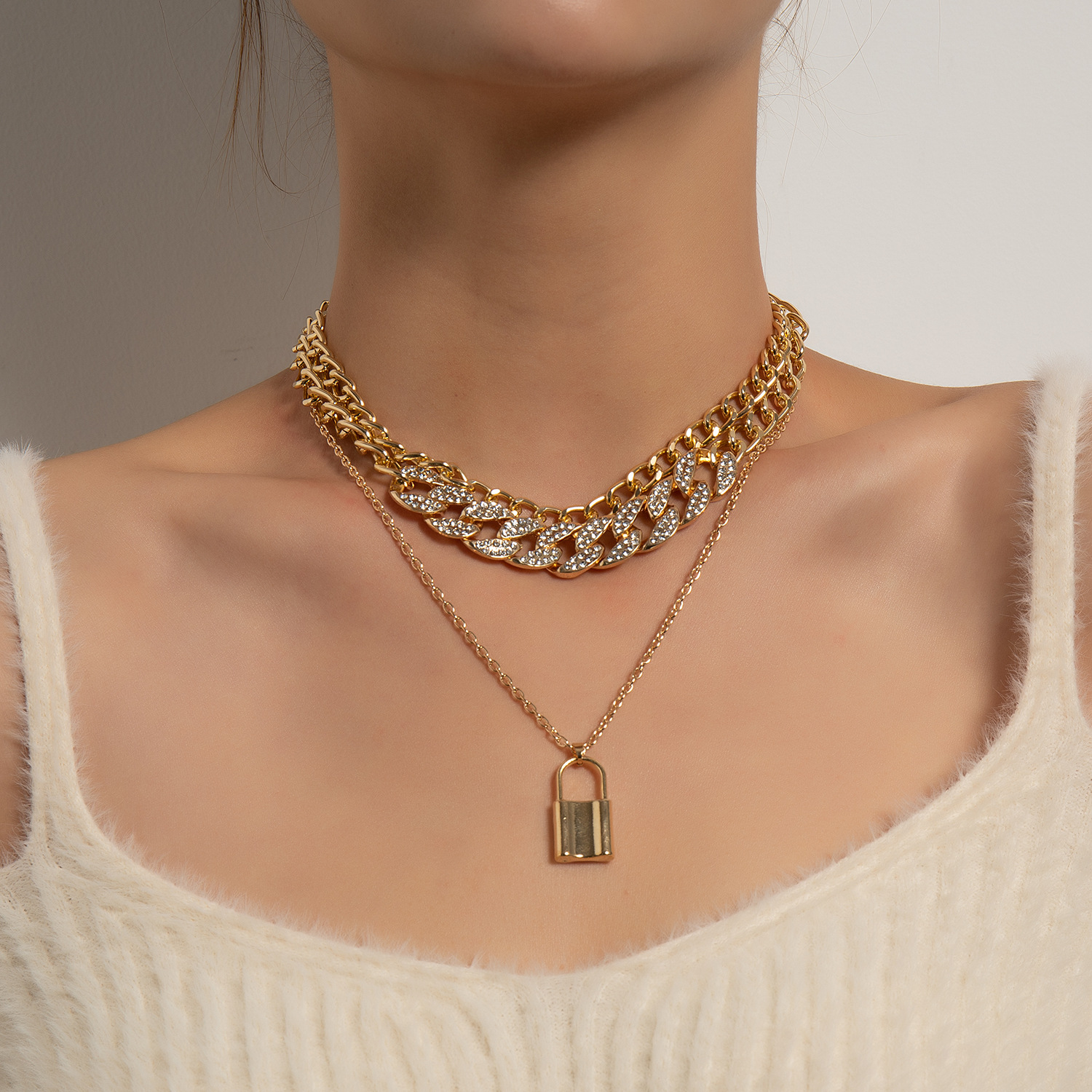 European And American Geometric Metal Lock Pendant Necklace Female Temperament Versatile Multi-layer Full Diamond Chain Necklace