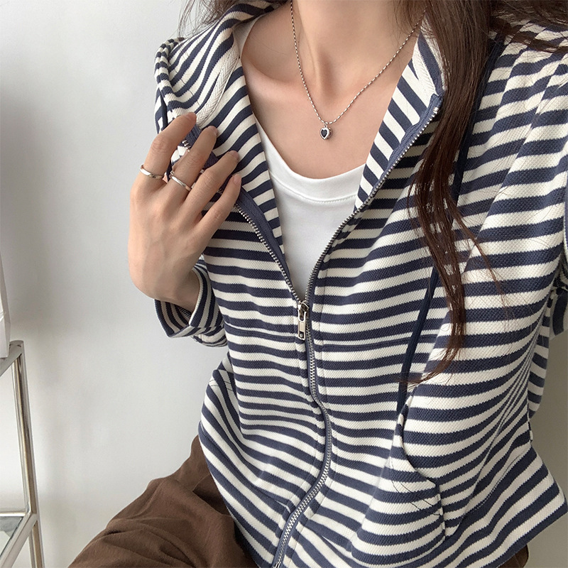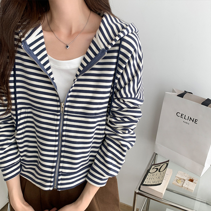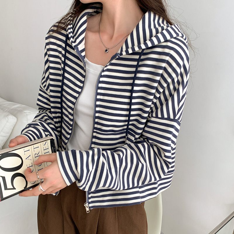 Striped Hooded Sweatshirt Jacket For Women Autumn Loose Zipper Long-sleeved Casual Short Cardigan Topy