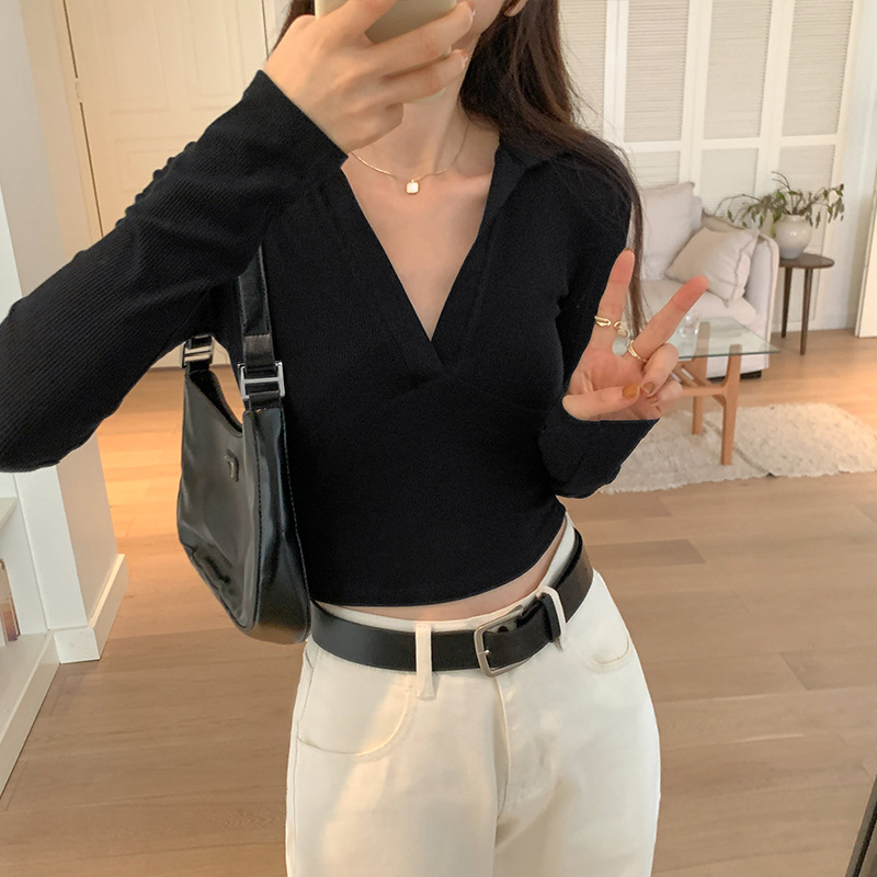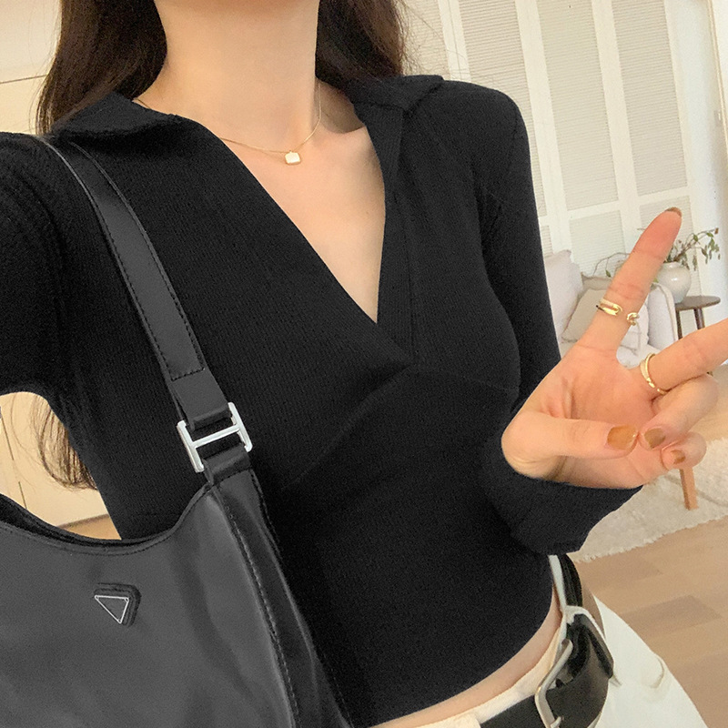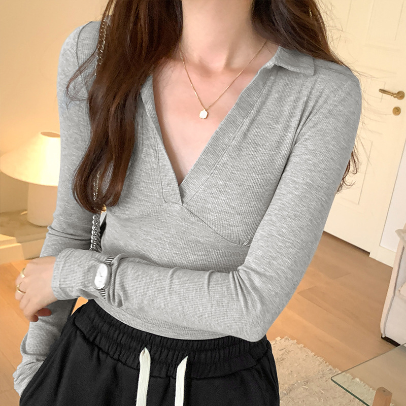 Threaded V-neck Hottie Long-sleeved T-shirt For Women Autumn Slim Fit Bottoming Shirt Versatile Short Top