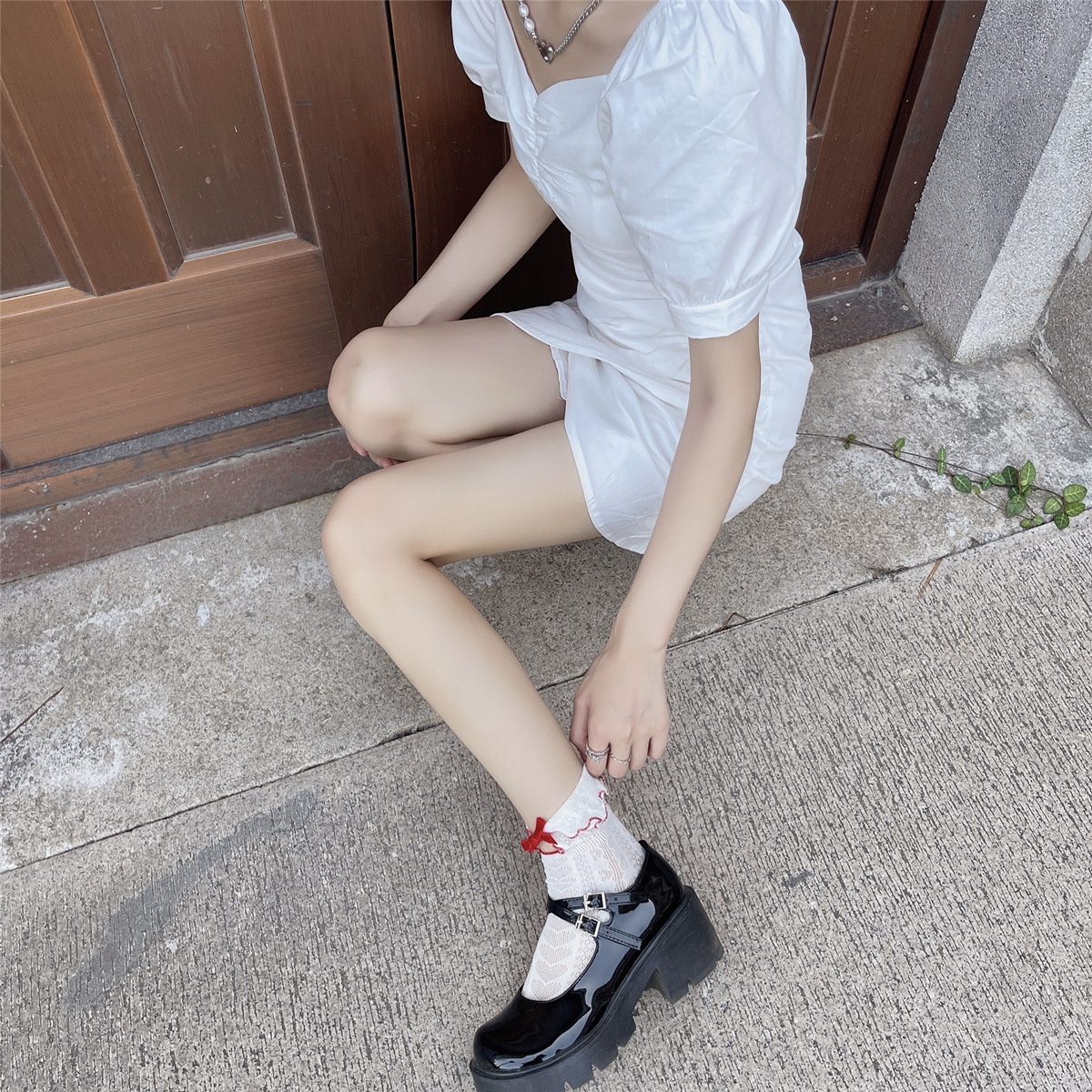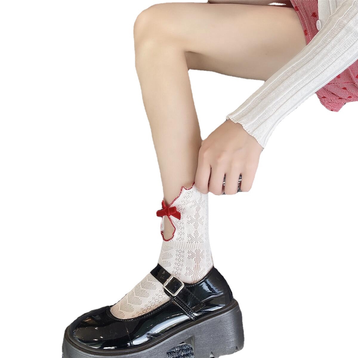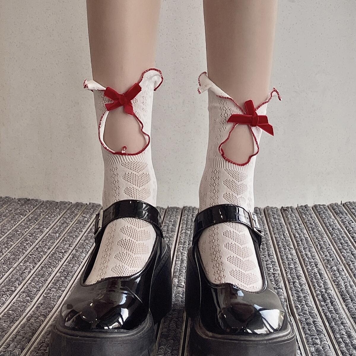 Japanese Retro Milky White Lolita J K Socks Red Velvet Bow Cotton Love Hollow Socks For Women