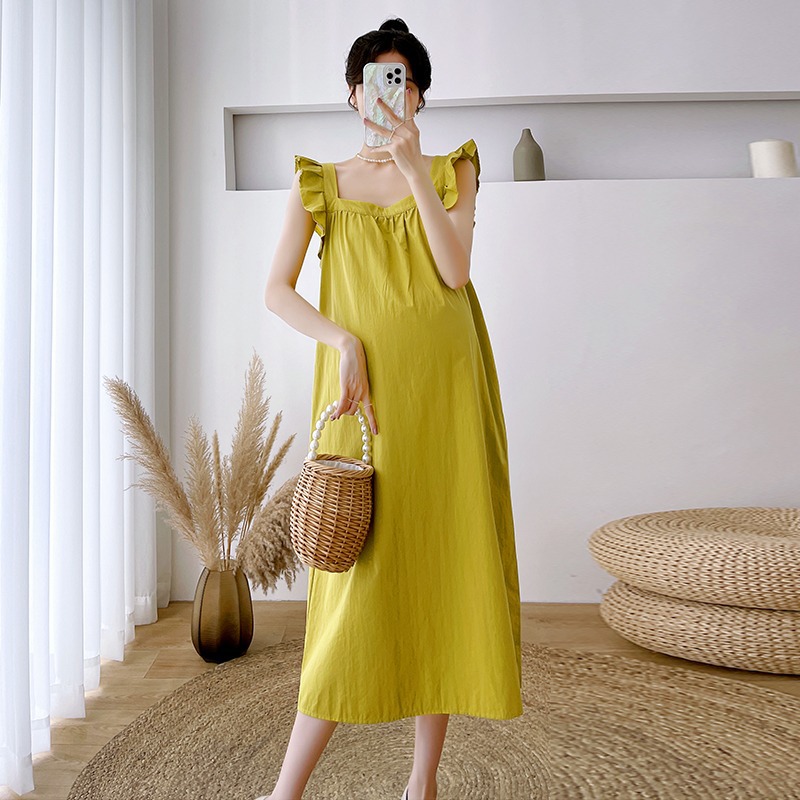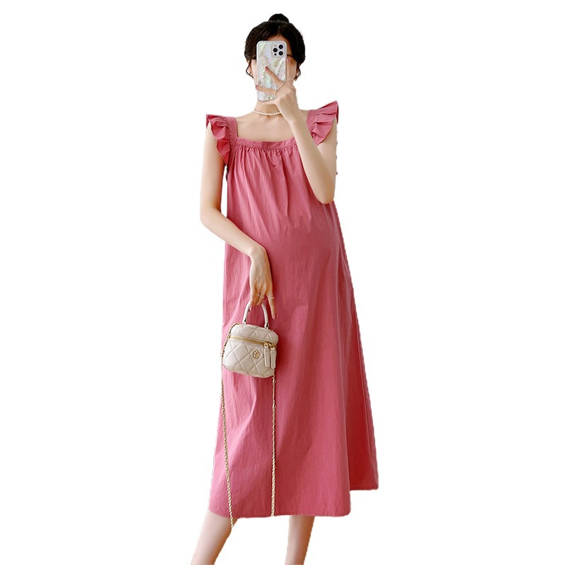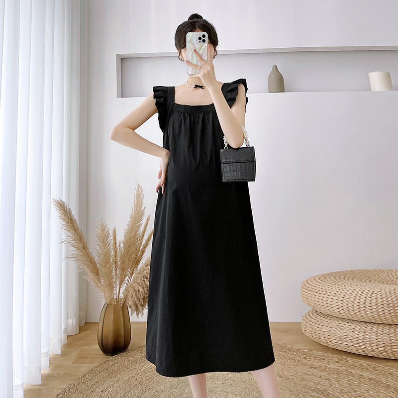 Summer Design Sense Wood Ear Edge Small Flying Sleeve Loose Slim Medium And Long Square Collar Pregnant Women Dress