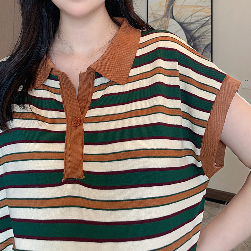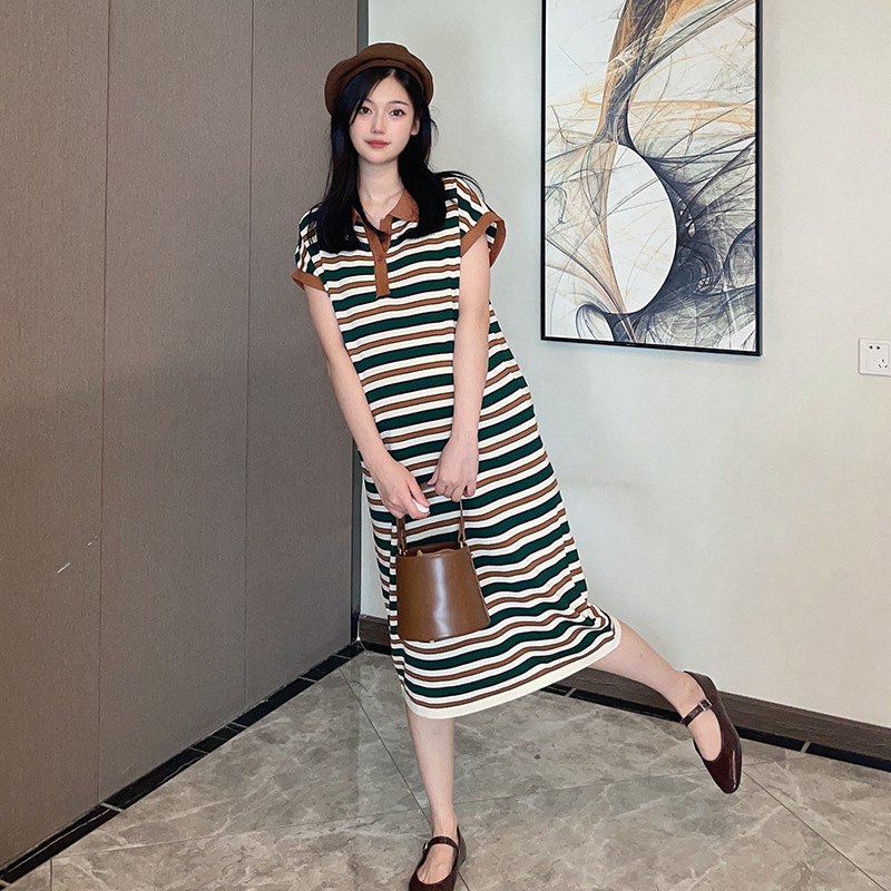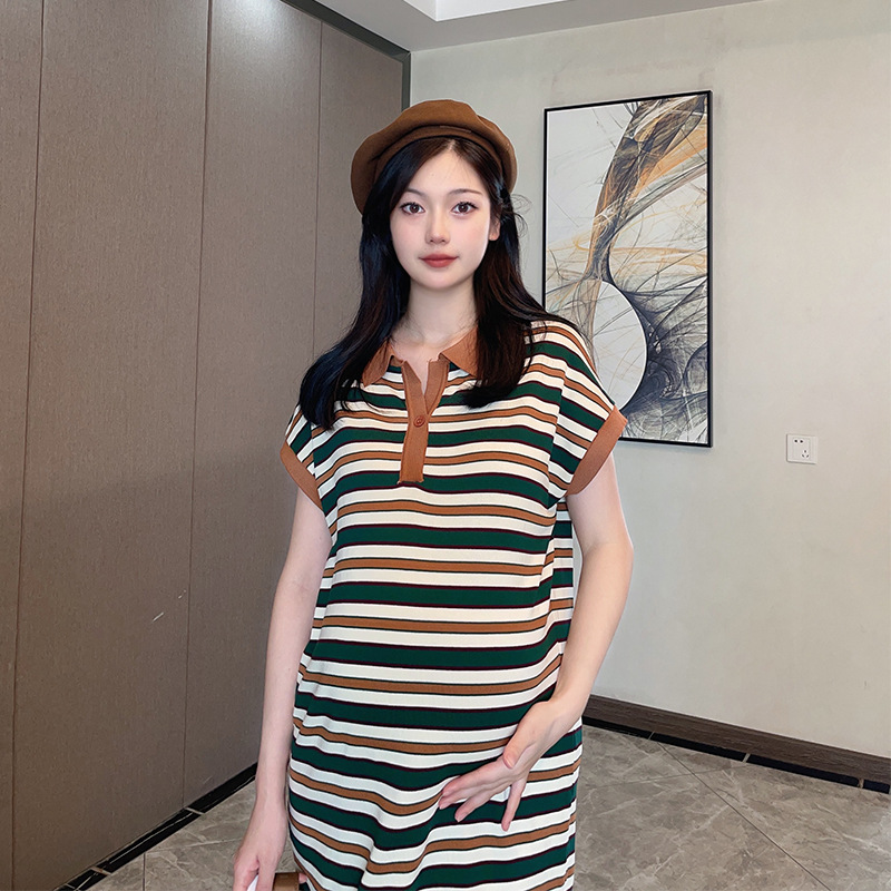 Xue Meifu Maternity Dress Summer Thin Ice Silk Knitted Dress Korean Version Contrast Color Polo Collar Loose Striped Dress