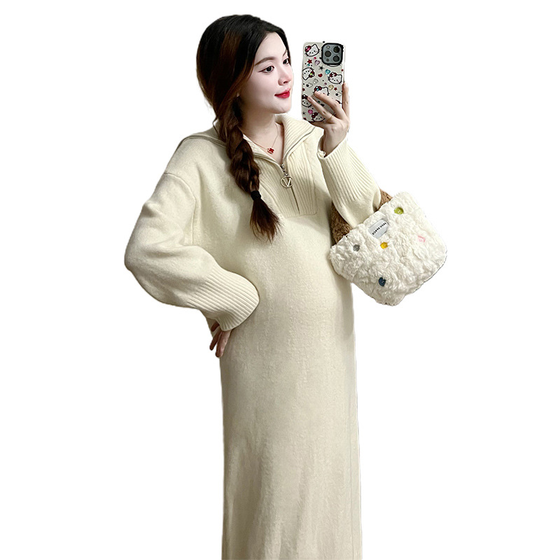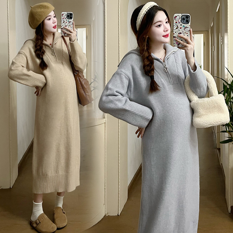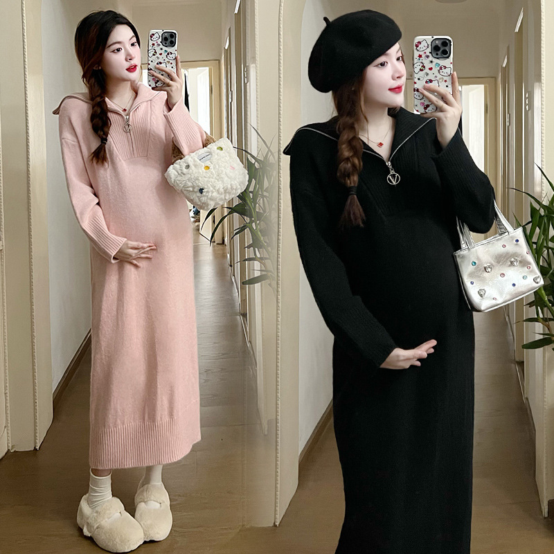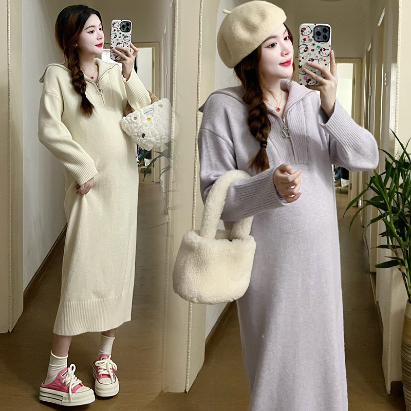 Pregnant Women Dress Autumn And Winter Korean Style Fashion Zipper Design Loose Large Size Long Bottoming Sweater Dress