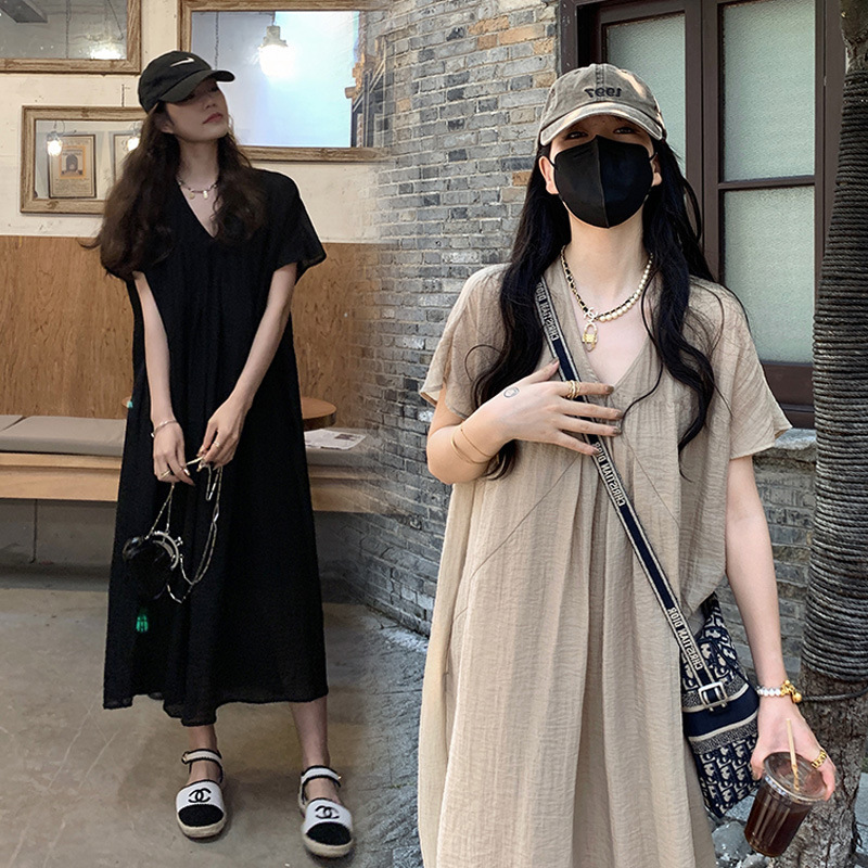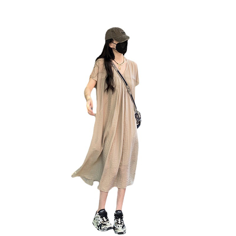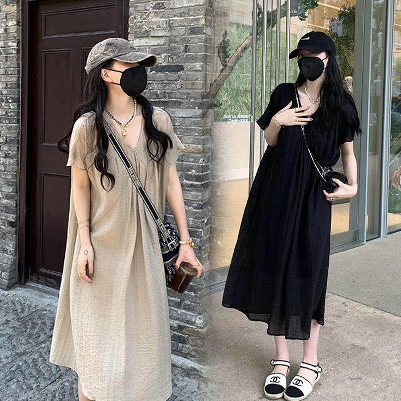 Maternity Dress Summer Lazy Style Casual Loose Solid Color Simple Temperament V-neck Mid-length Dress