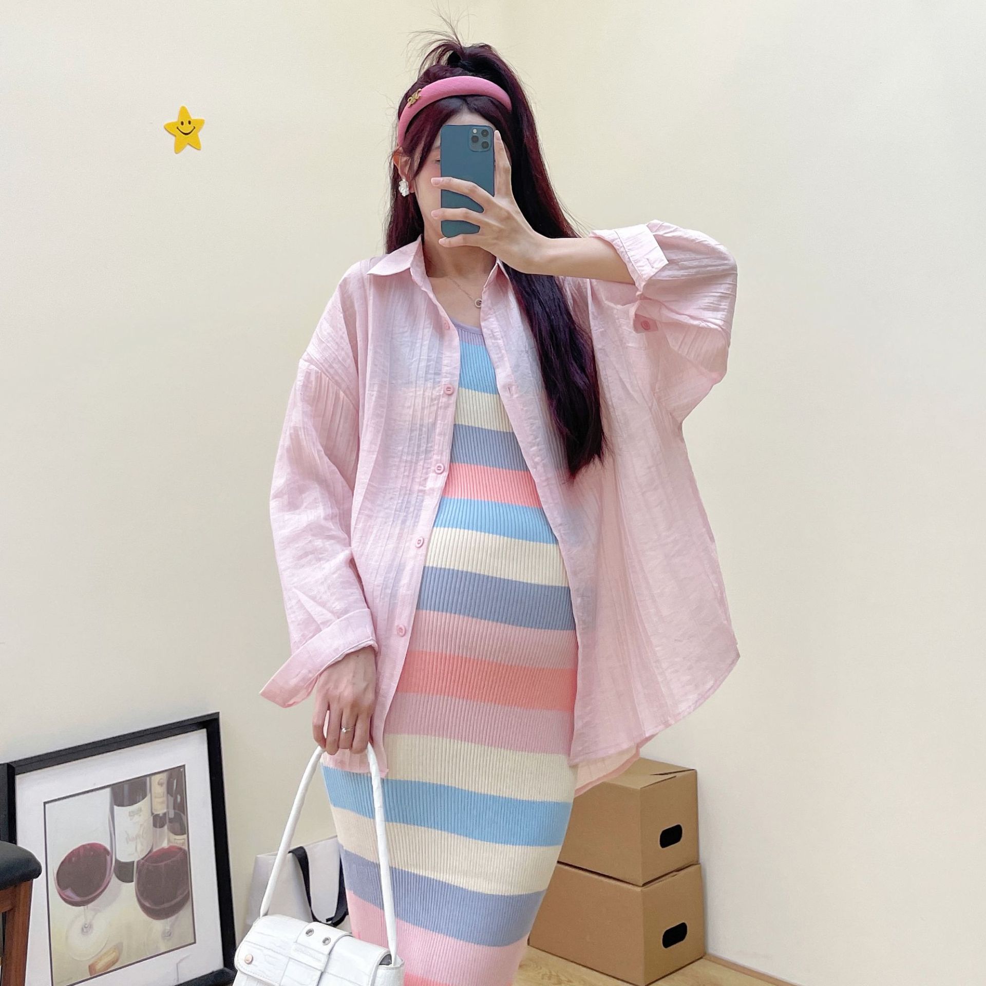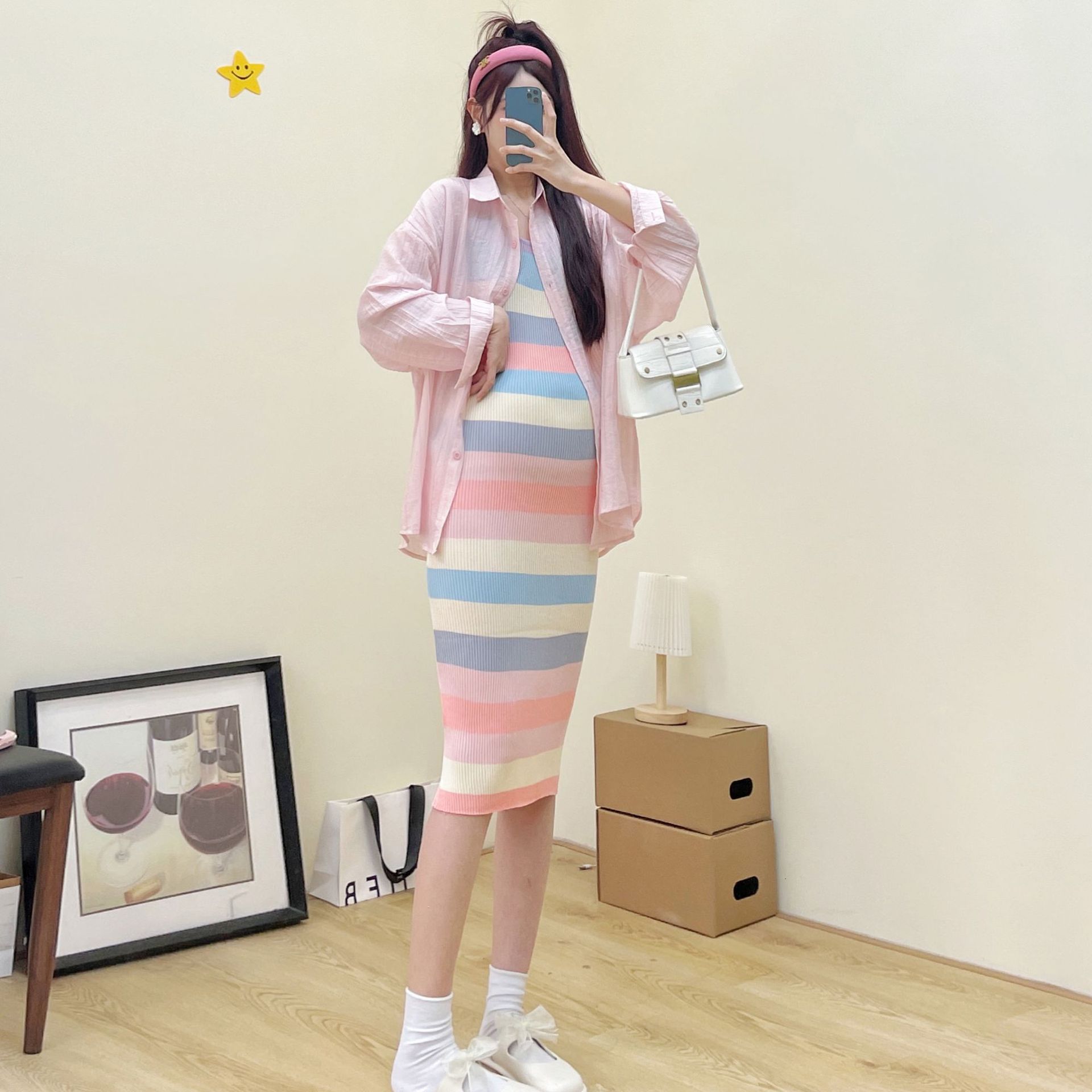 Xue Meifu Maternity Dress Spring And Summer Fashion Hot Mom Rainbow Stripes Slim Knitted Vest Dress Sunscreen Shirt