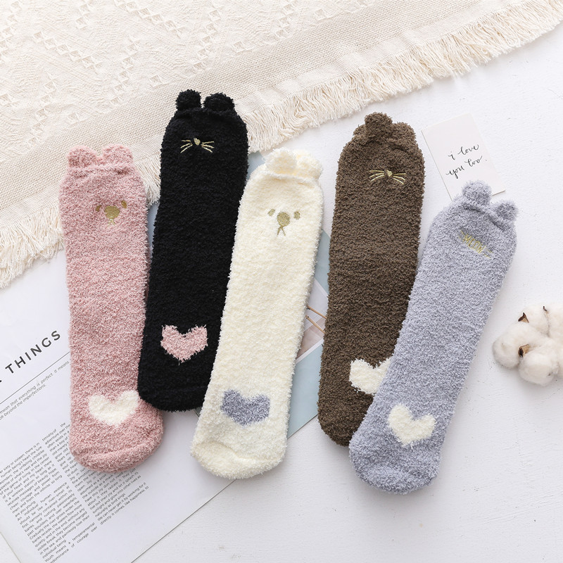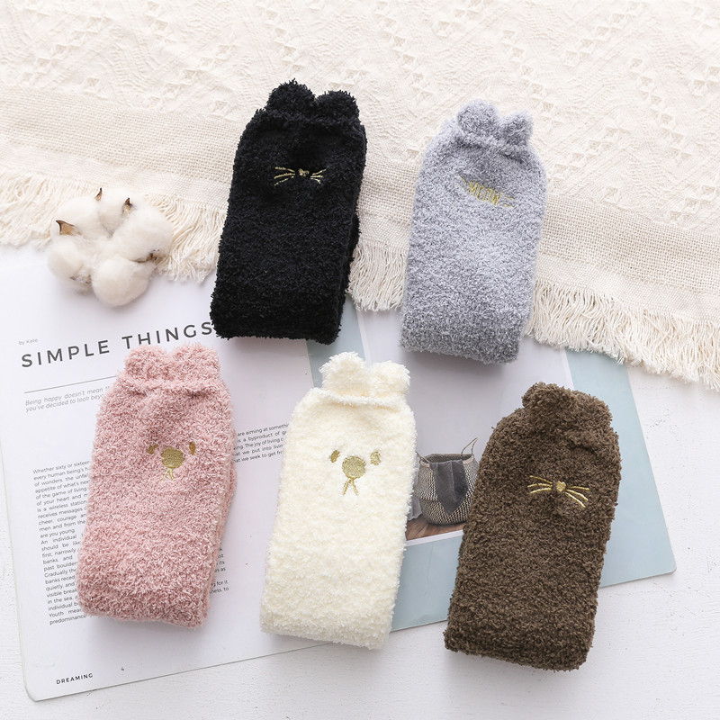 Japanese Coral Fleece Women's Socks Embroidered Cat Sleeping Socks Korean Version Cute Love Home Floor Socks Ear Cartoon Socks