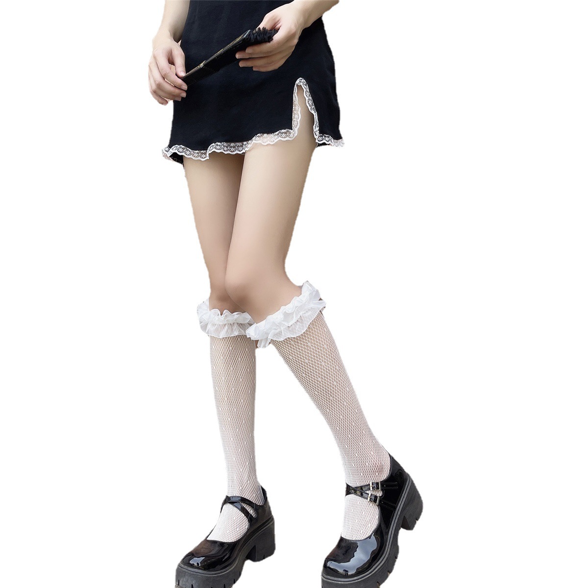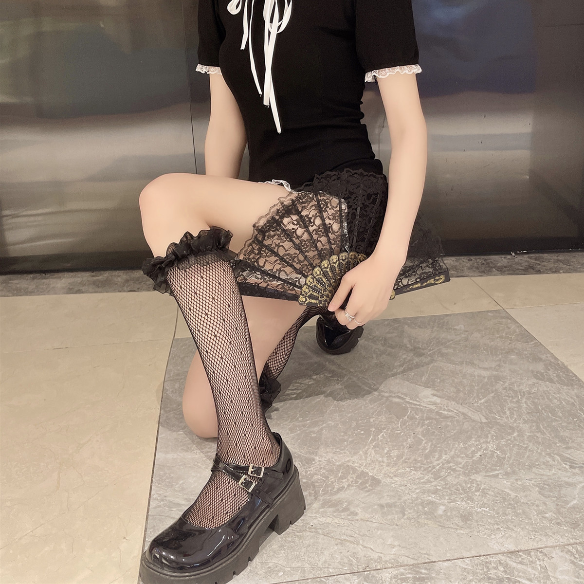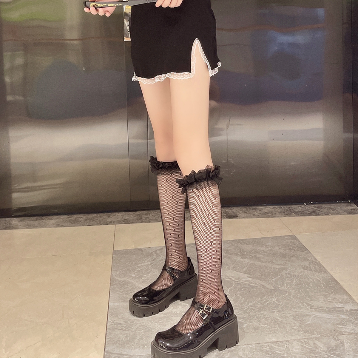 Dark Series Small Dots Jacquard Hollow Fishnet Stockings Mesh Pleated Lace Black Calf Socks Two-wear Socks