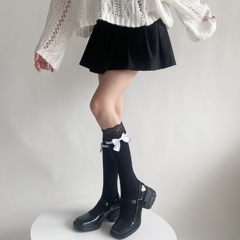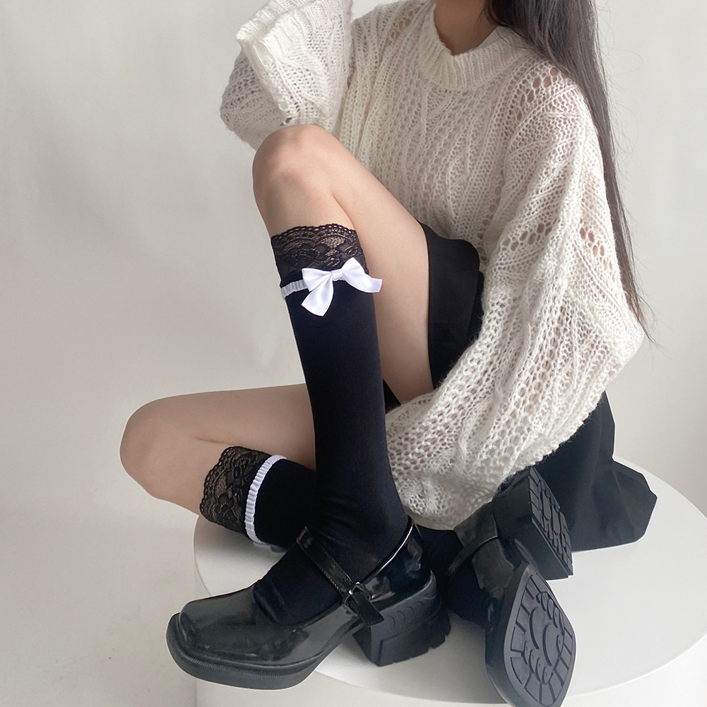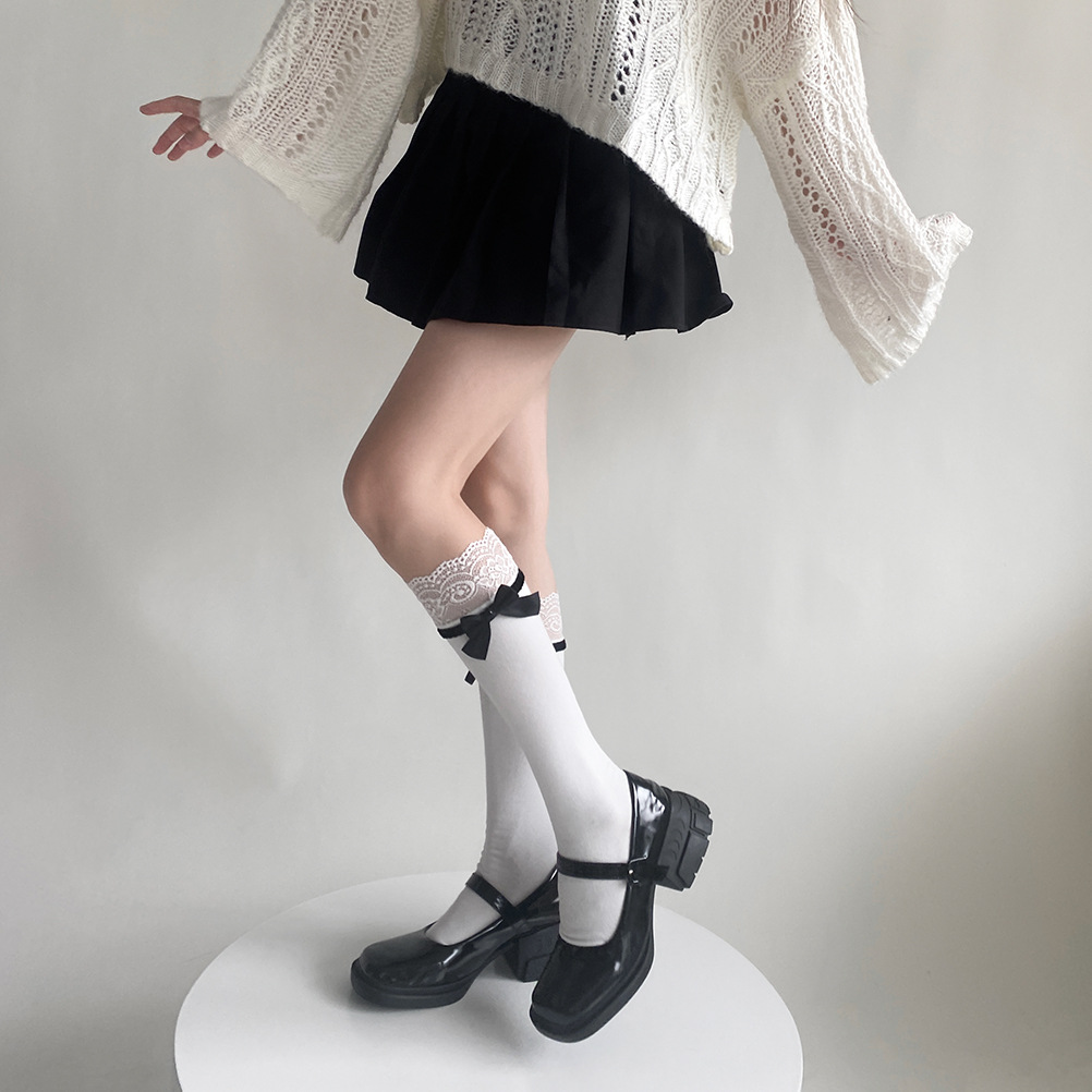 Japanese Jk Bow Cotton Lace Stitching White Calf Socks Half-length Pile Socks Women Autumn And Winter Mid-tube Socks
