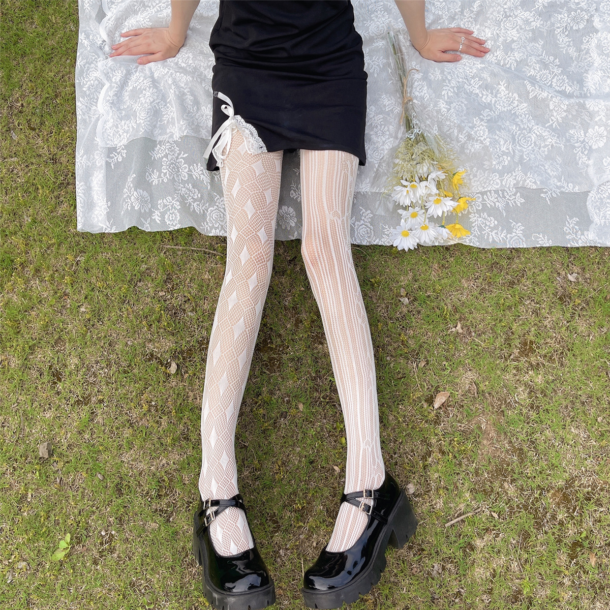 Japanese White ABDiamond Stripes Love Jacquard Hollow Fishnet Stockings Pantyhose Dark Thin Stockings