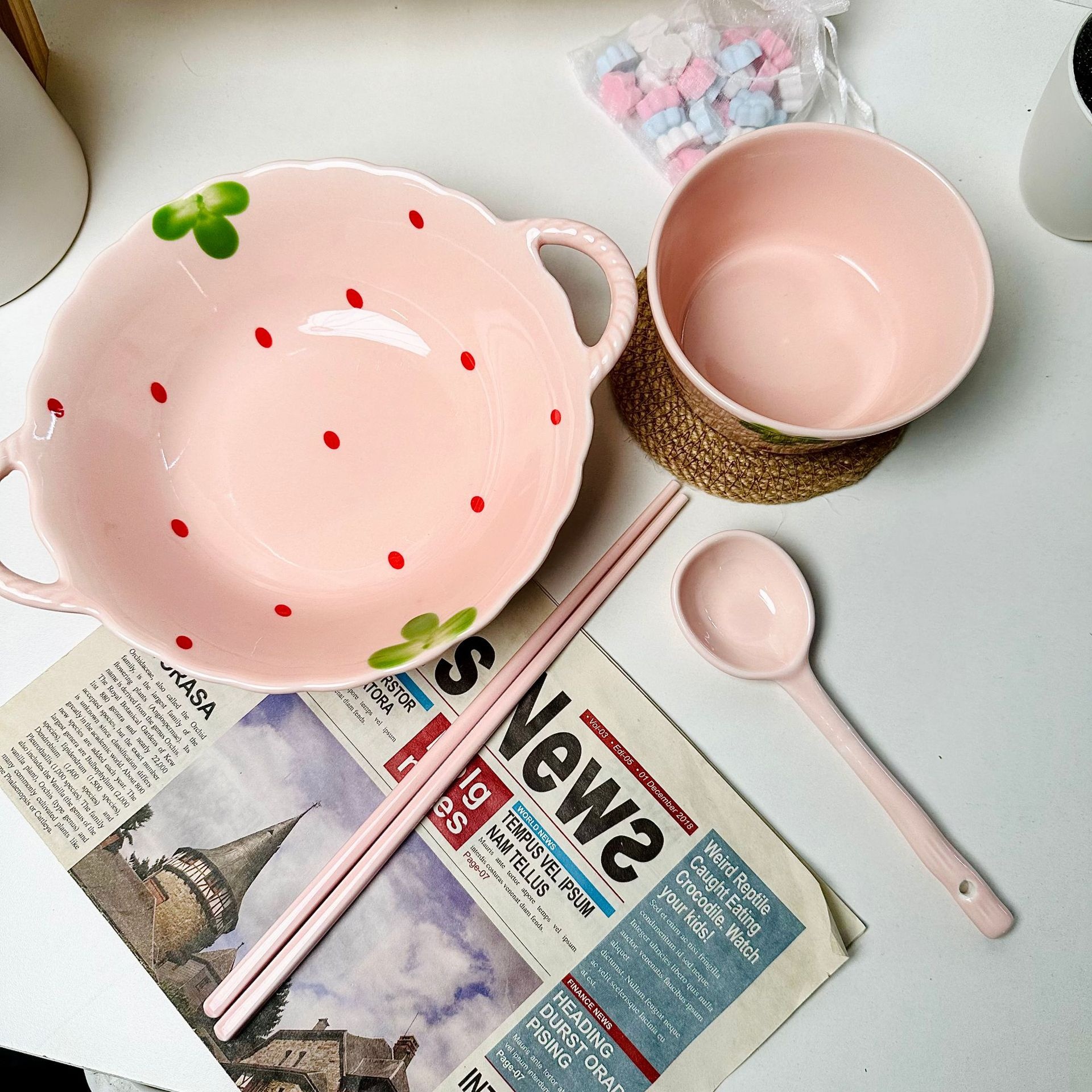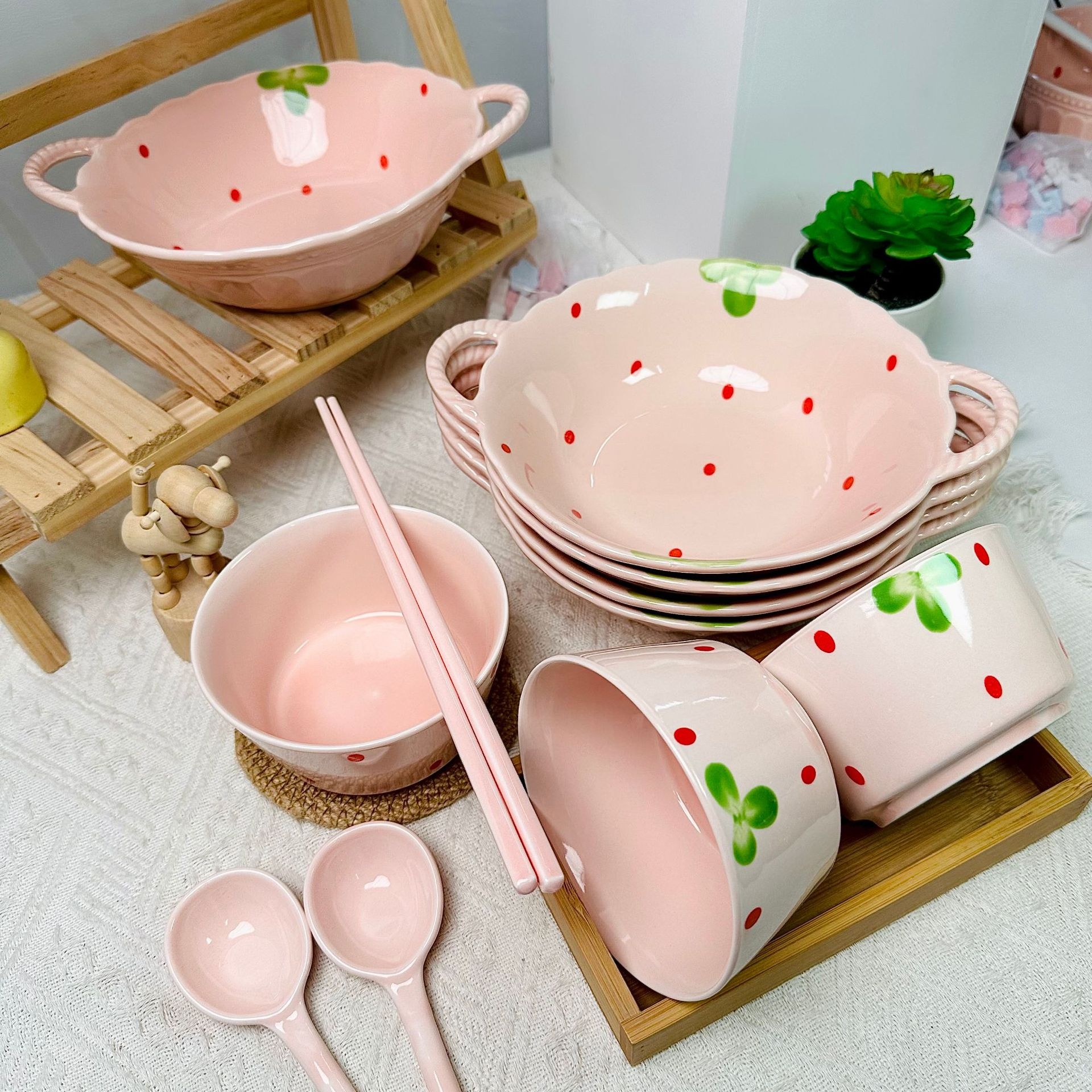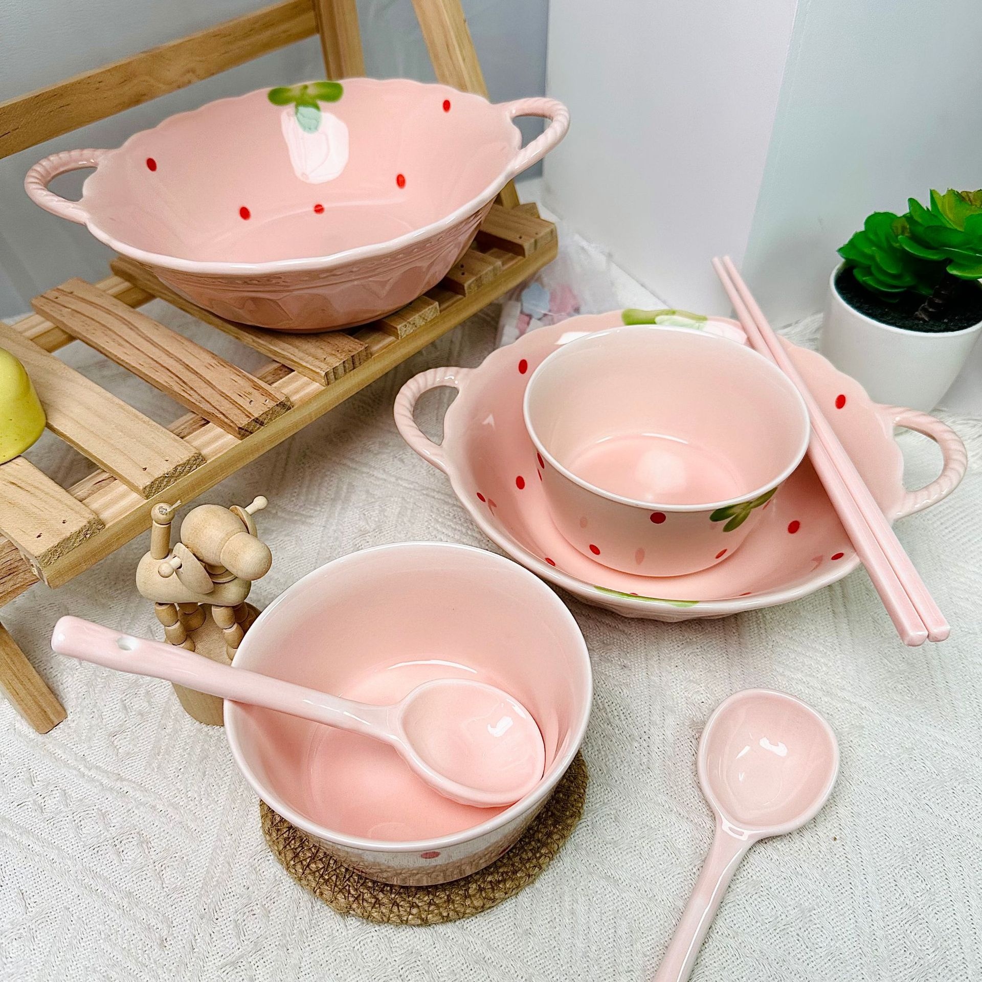 Household Cute Double-ear Soup Bowl Strawberry Girl Set Ceramic Soup Bowl Tableware Rice Bowl High-value One-person Food Set