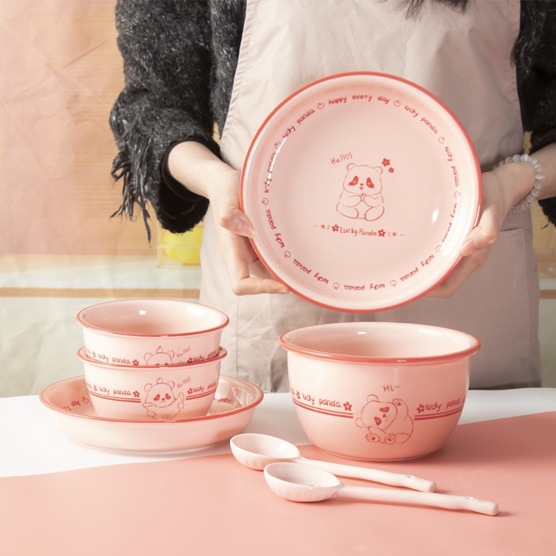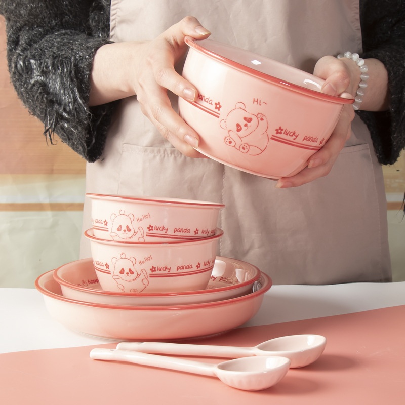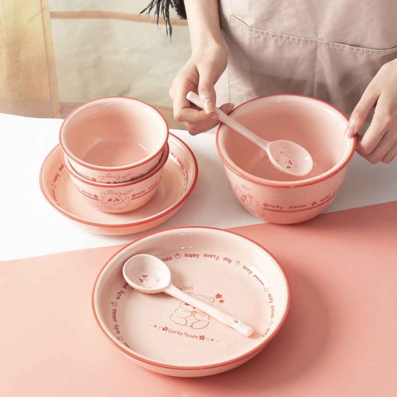 Pink Cute Bear Household Cute Rice Bowl Cute Spoon Pet Pink Girl Net Red Ceramic Tableware Bowl Plate