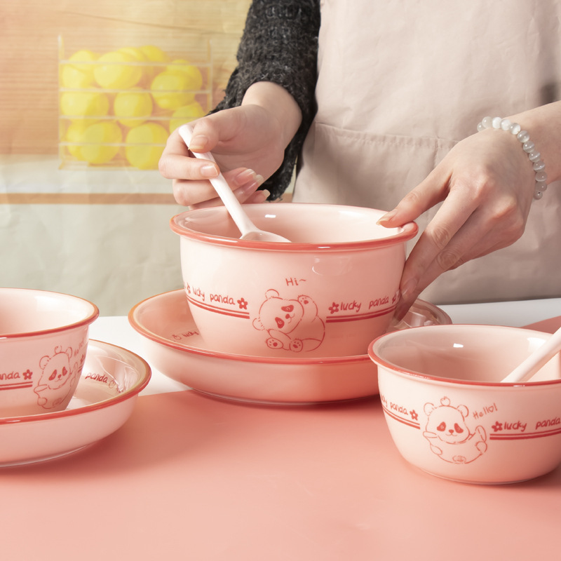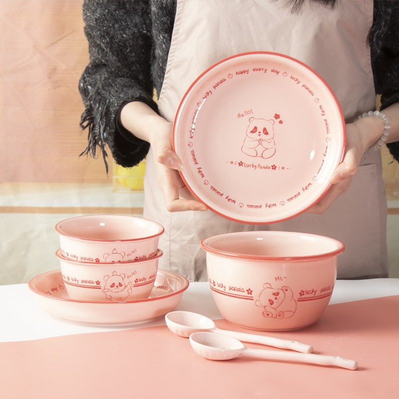 (Cute Bear7-piece Set)Household Cute Cute Pet Pink Girl Internet Celebrity Ceramic Tableware Combination Set
