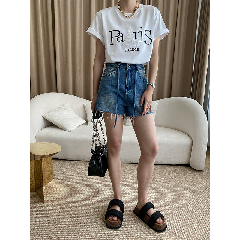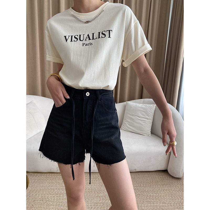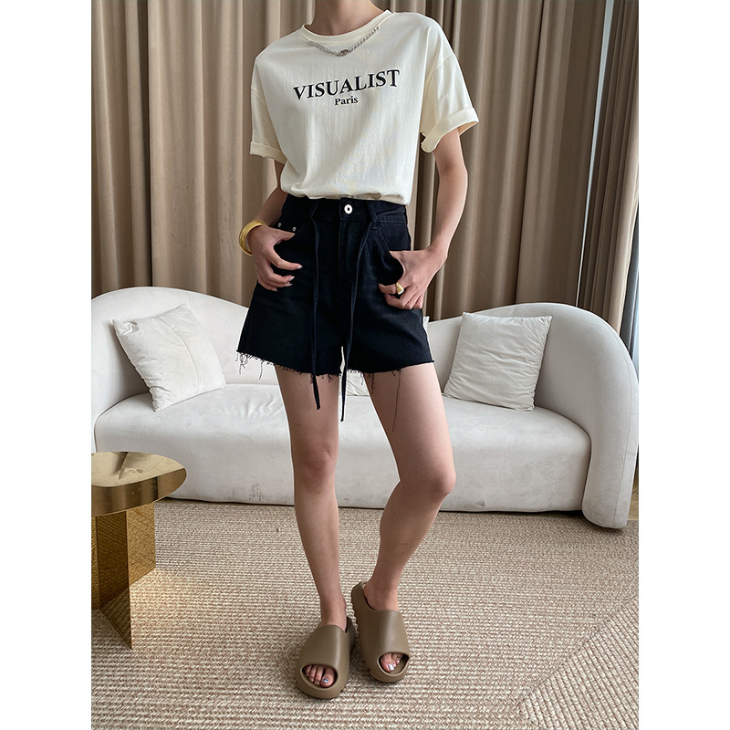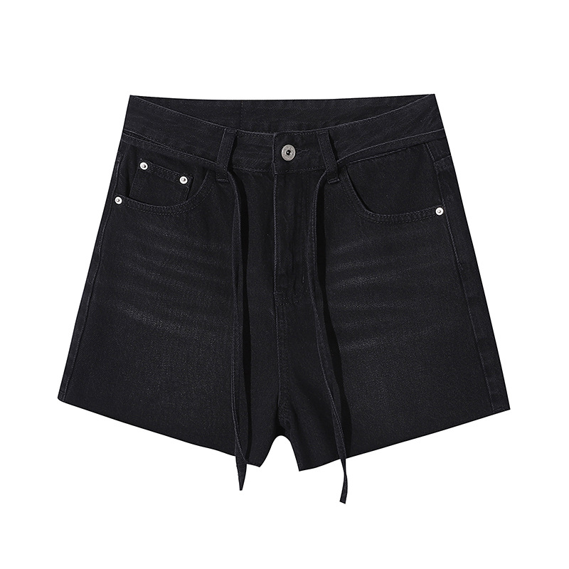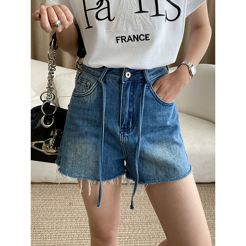 Sinan Casual Design Strappy Raw Edge Denim Shorts High Waist Versatile Slim A-line Hot Pants SN3511