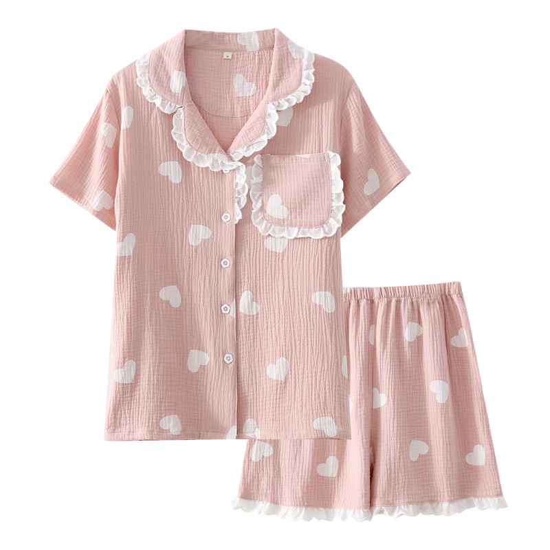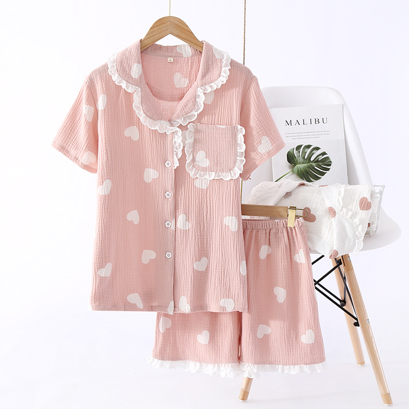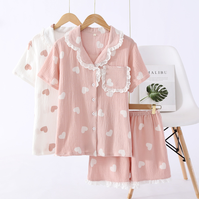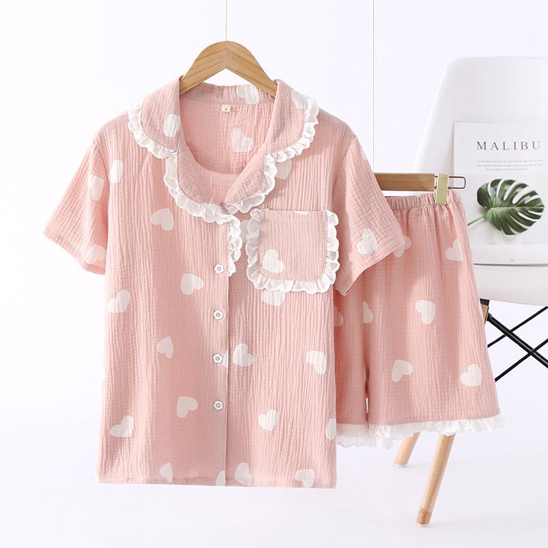 Cotton Crepe Love Summer Pajamas Lace Collar Pure Style Short-sleeved Shorts Suit Washed Cotton Home Clothes For Women