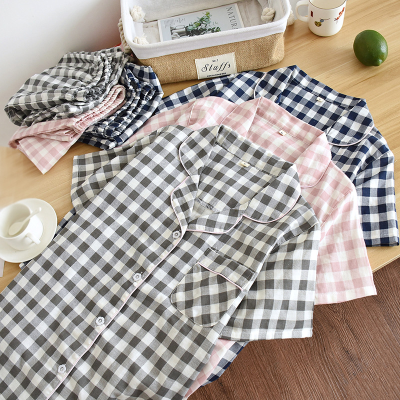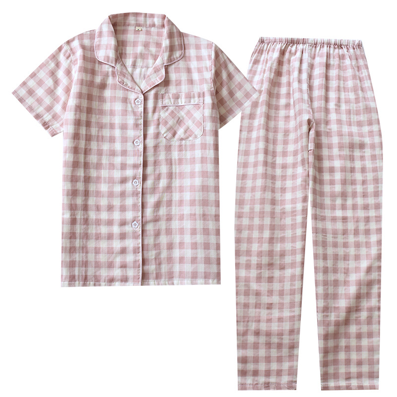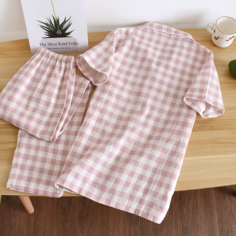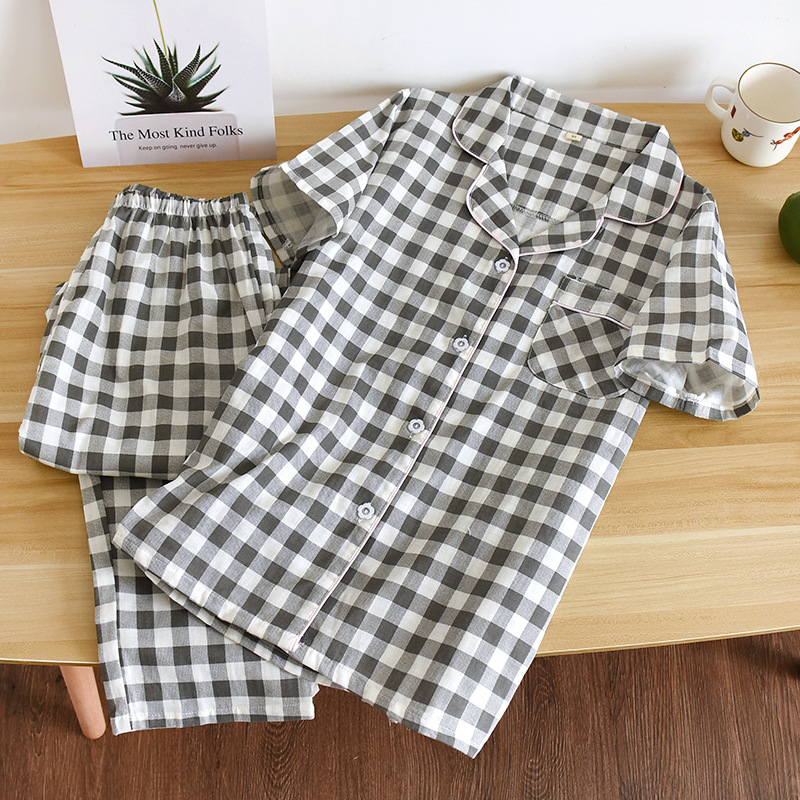 Couple Plaid Home Clothes Cotton Gauze Short-sleeved Trousers Pajamas Ladies Thin Men's Spring And Summer Suit Cotton Yarn