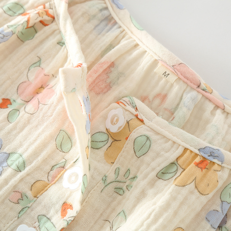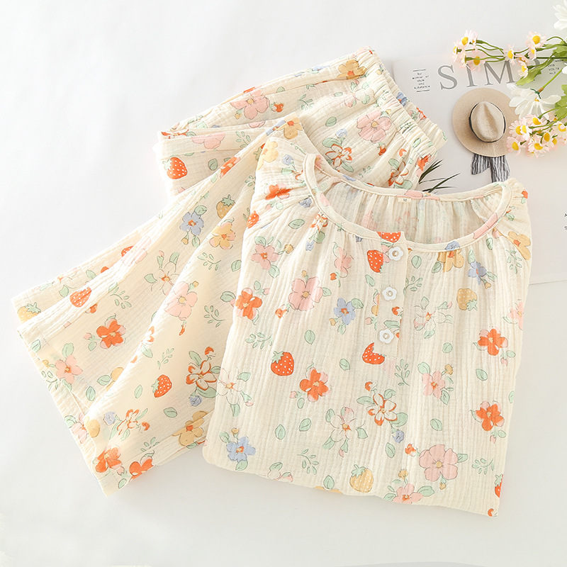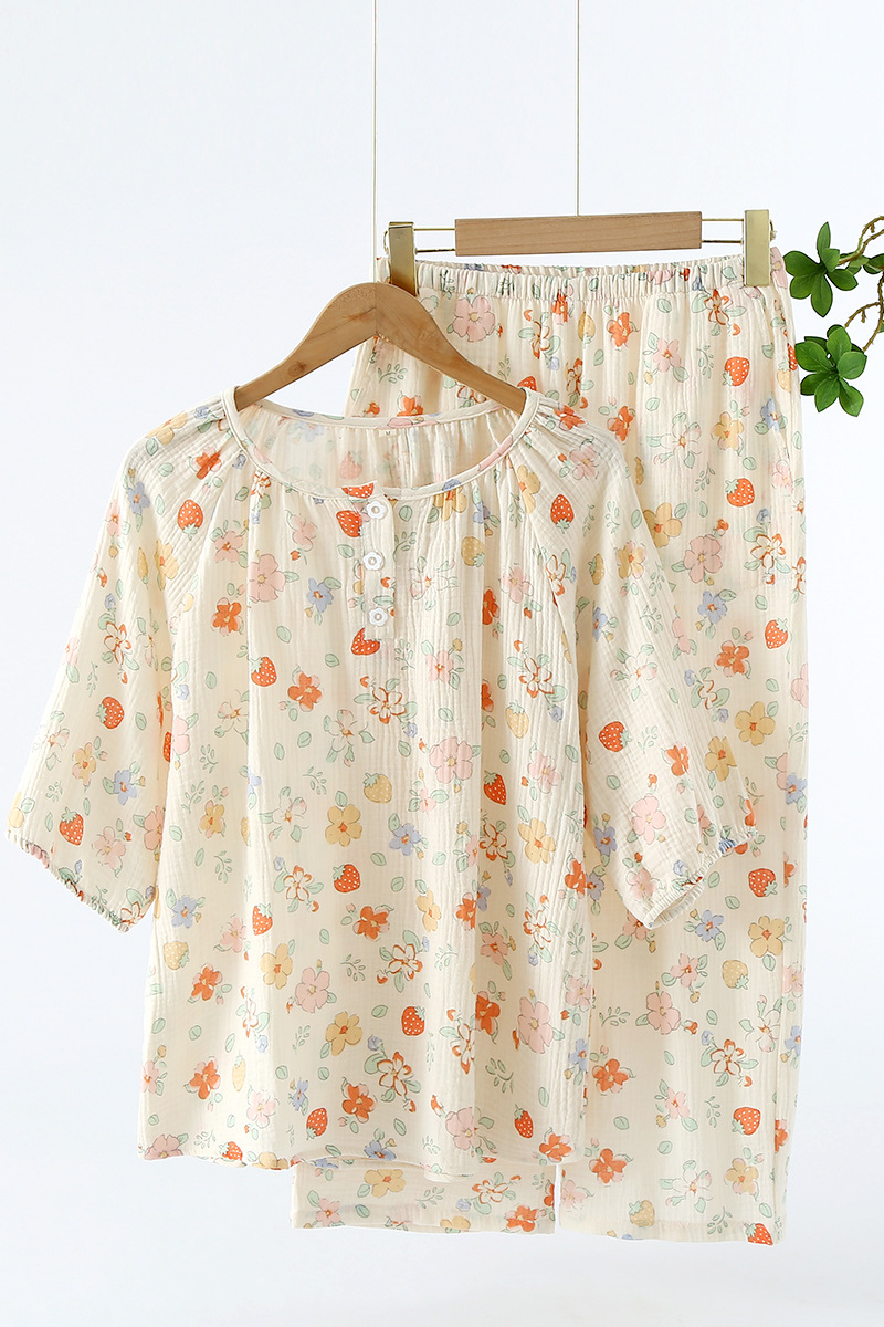 Women's Pajamas Summer Sweet Floral Cotton Yarn Short-sleeved Cropped Pants Ladies Round Neck Thin Jieyang Cotton Home Clothes