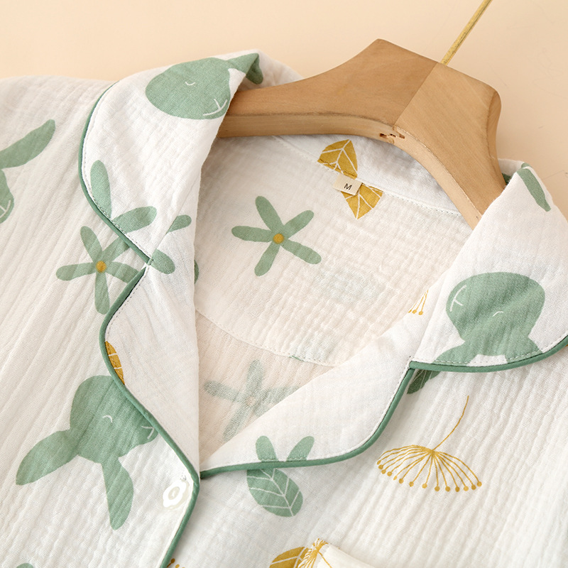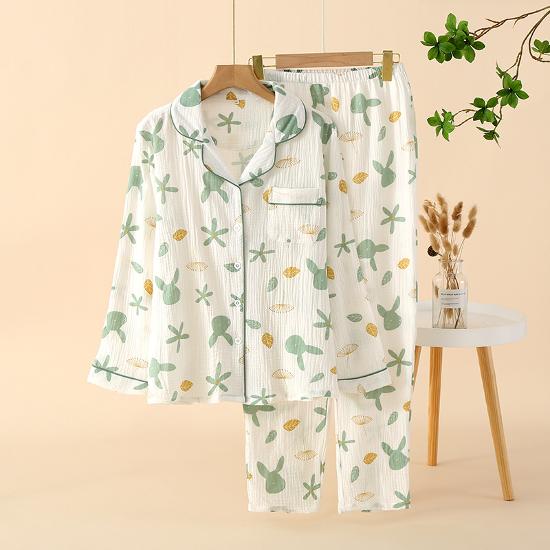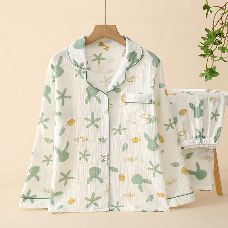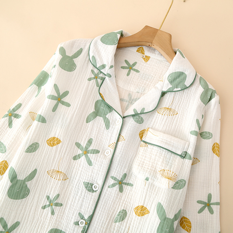 [Cute Rabbit]Pure Cotton Girls Double-layer Gauze Pajamas Long-sleeved Trousers Home Clothes Spring And Autumn Ladies Two-piece Set