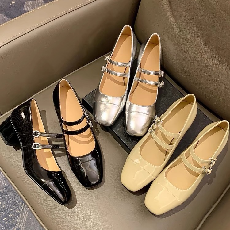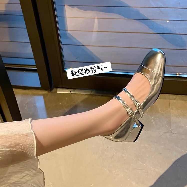 Silver Square Toe Shallow Mouth One-strap Mary Jane Shoes French Retro Thick Heel Single Shoes Mid-heel High Heels