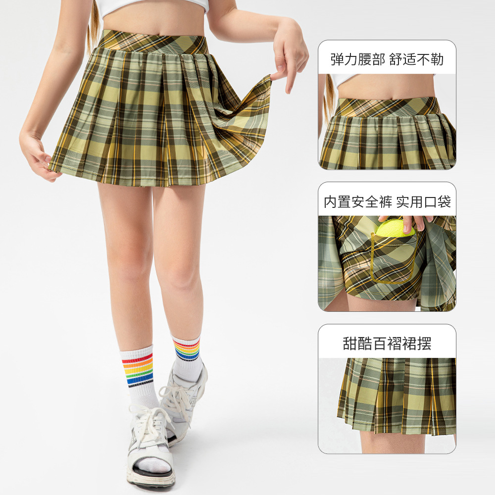 Children's Tennis Skirt Fake Two-piece Plaid Pleated Skirt Girls Sports Short Skirt Dance Training Short Skirt Pants23409