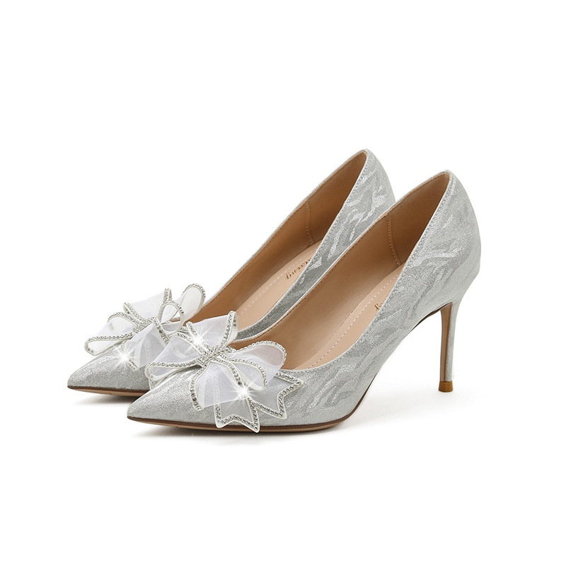 Wedding Shoes Women's Stiletto Pointed Bow Korean Style Temperament Single Shoes Bridesmaid Wedding Crystal High Heels