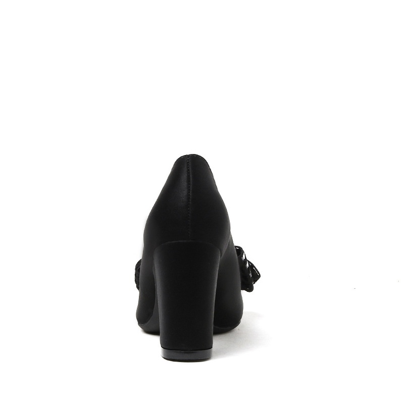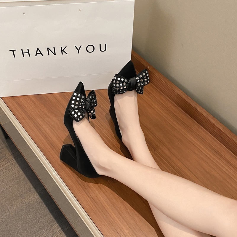 Professional All-match Work Thick-heeled High-heeled Shoes With Pointed Toe And Shallow Bow,Comfortable Commuting And Fashionable Black Single Shoes