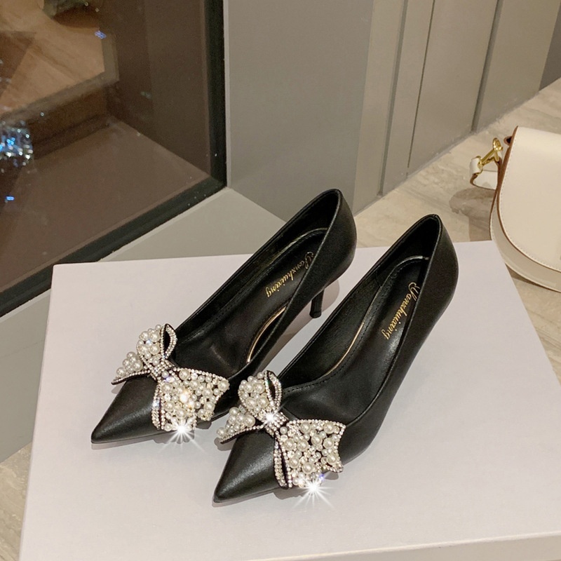White Pearl Wedding Shoes Stiletto Pointed Toe Shallow Mouth Korean Style Fashionable All-match Rhinestone Bridal High Heels