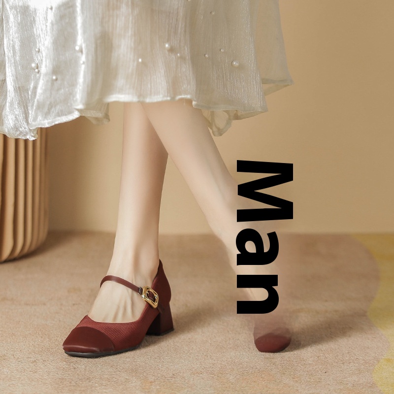 Shallow-mouth Single Shoes For Women Spring French Square-toed Thick-heeled Mary Jane Shoes For Women Wine Red High-heeled Single Shoes