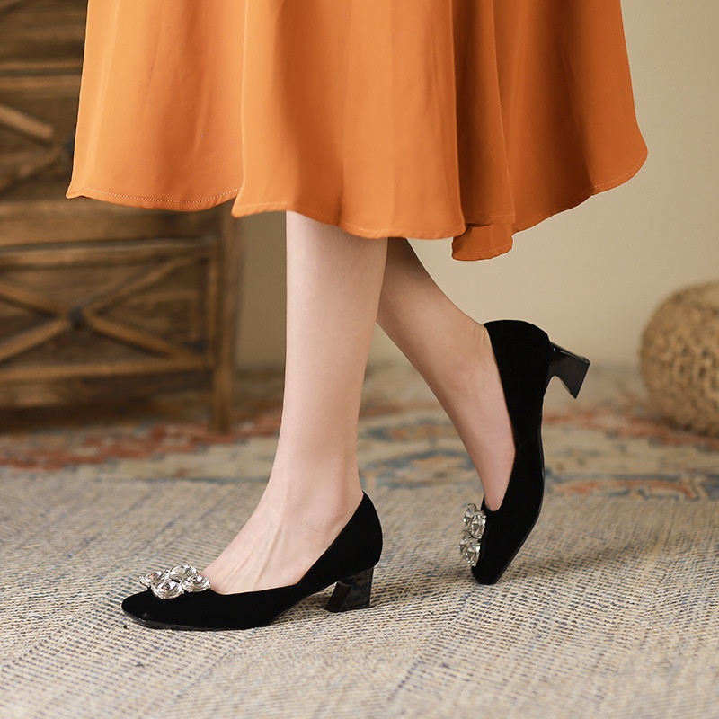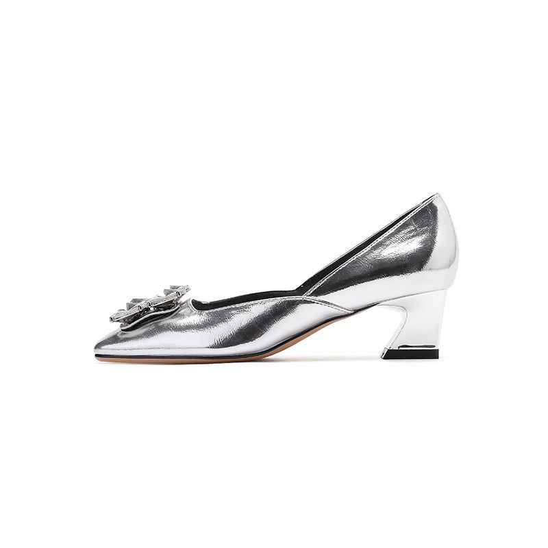 488-1 Rhinestone Square Toe Shoes For Women Autumn French Style Thick Heel High Heels Silver Soft Leather Women's Shoes
