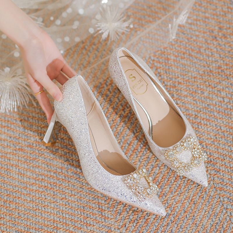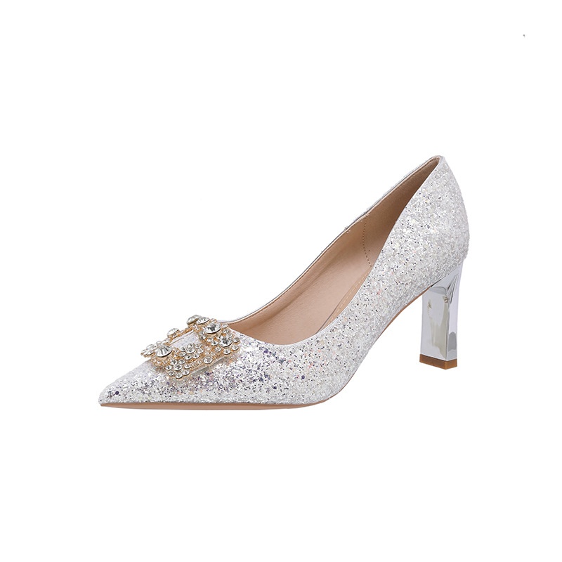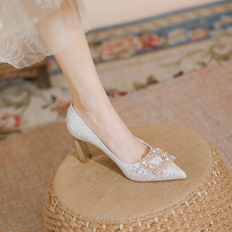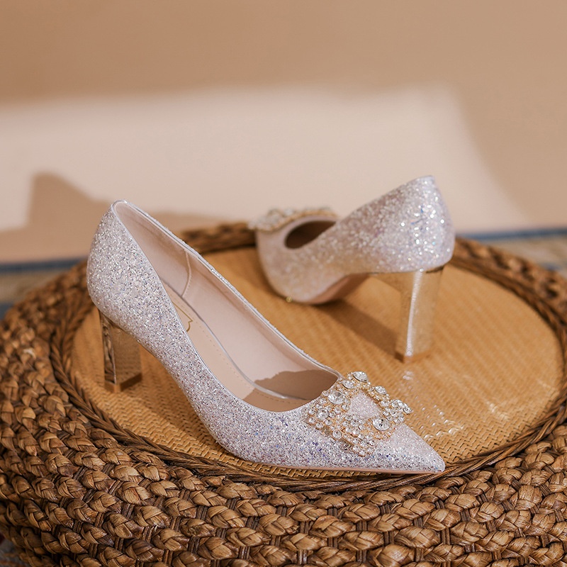 Cinderella Silver Wedding Shoes For Women Rhinestone Square Buckle Wedding Dress Banquet Two-wear Toast Not Tired High Heels