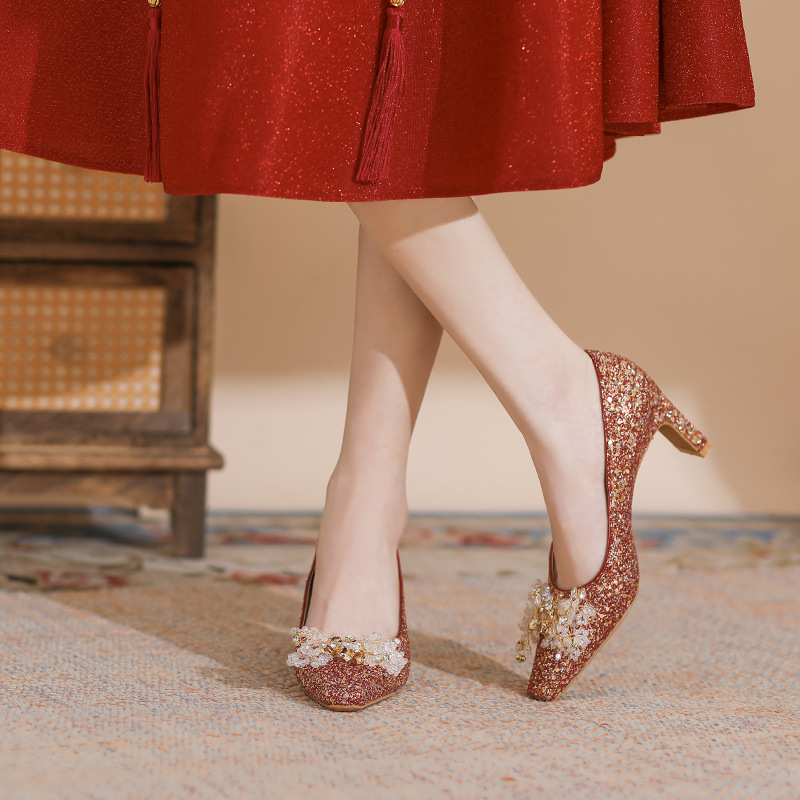 Chinese Xiuhe Wedding Dress Red Wedding Shoes For Women Small Square Head Rhinestone Flower Buckle Bridal High Heels Do Not Tire Your Feet