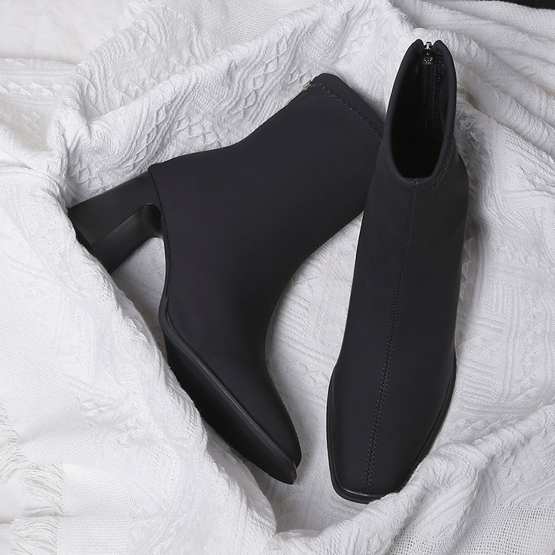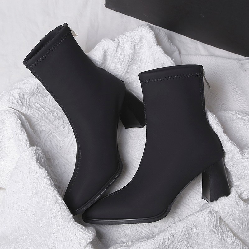 Soft Leather High Heeled Ankle Boots For Women Autumn And Winter Thick Heel Square Toe Rear Zipper British Fashion Boots Plus Velvet Slim Boots