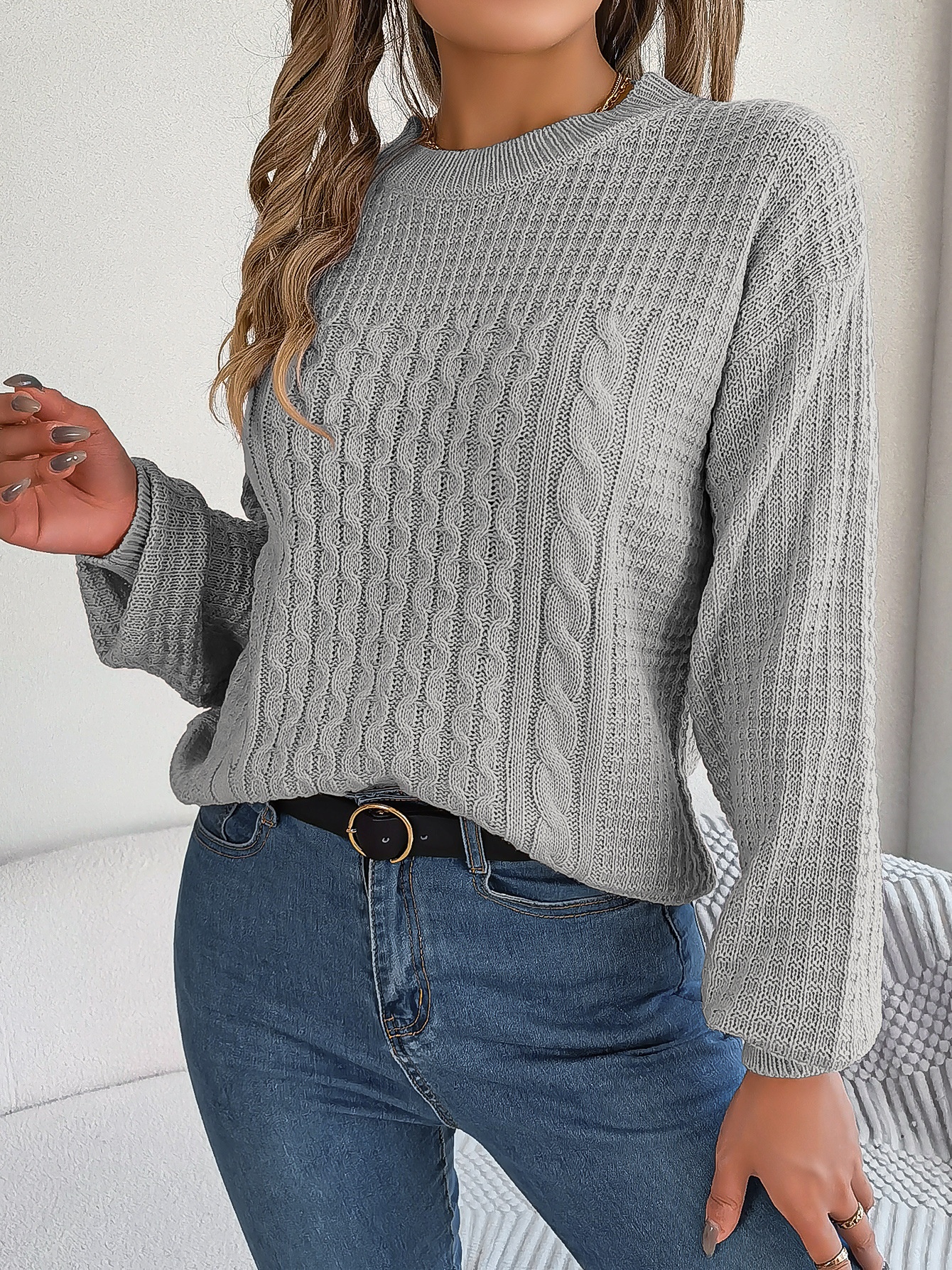 实拍休闲纯色麻花灯笼袖套头毛衣独立站女装