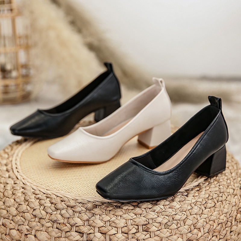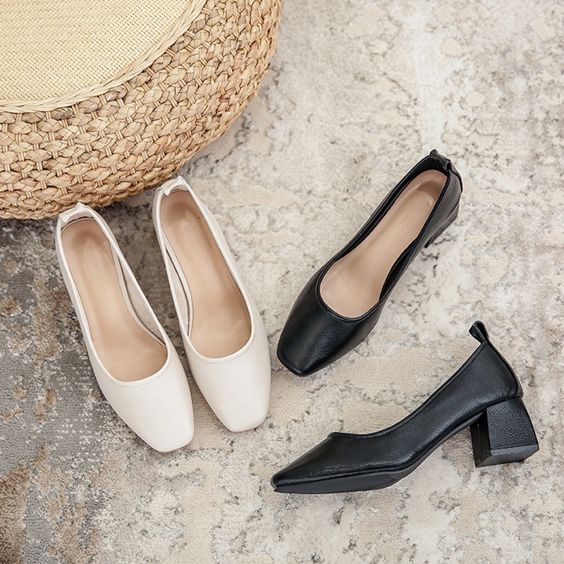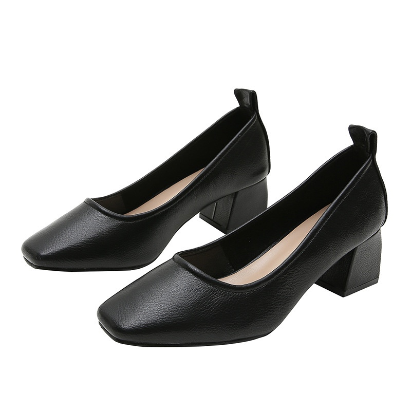 Women's Single Shoes Thick Heels Square Head Soft Leather Grandma Shoes Shallow Mouth Soft Leather Hotel Work Professional Work Shoes Women