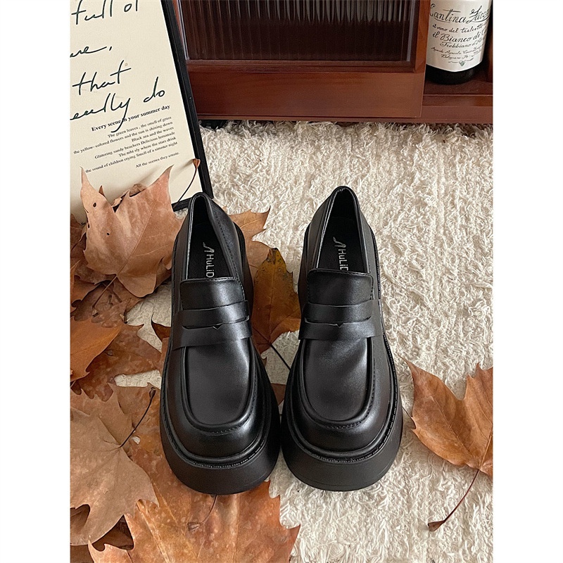 Retro British Style Black High Heel Thick Bottom Leather Shoes For Women Spring And Summer Style Slip-on Thick Heel Loafers