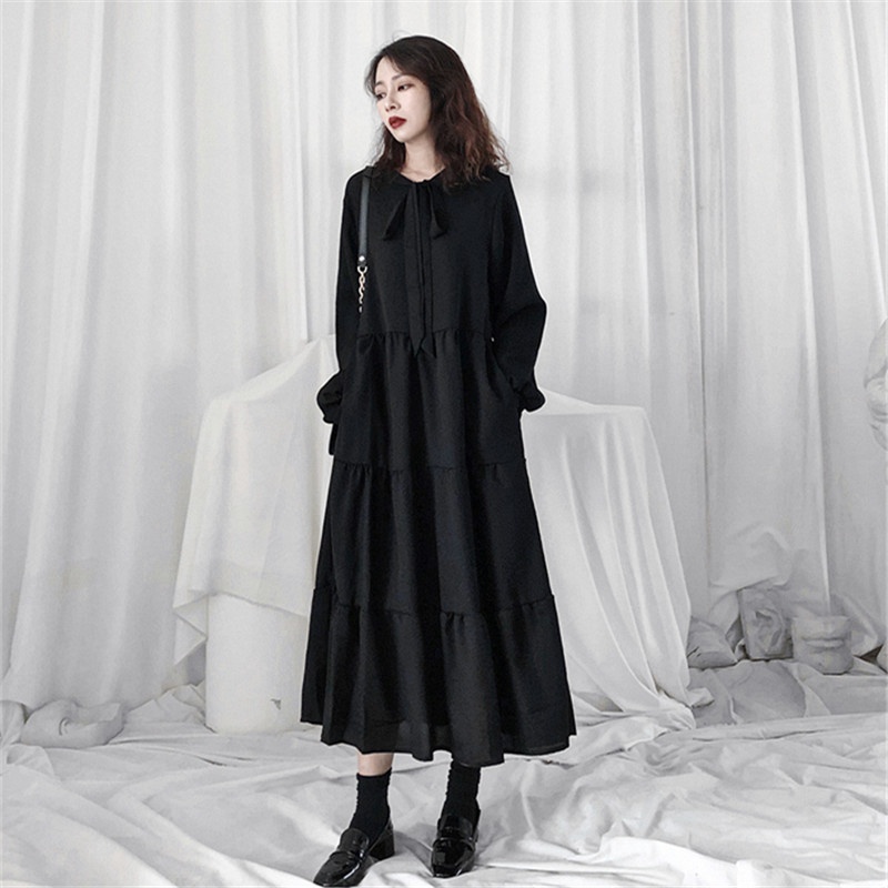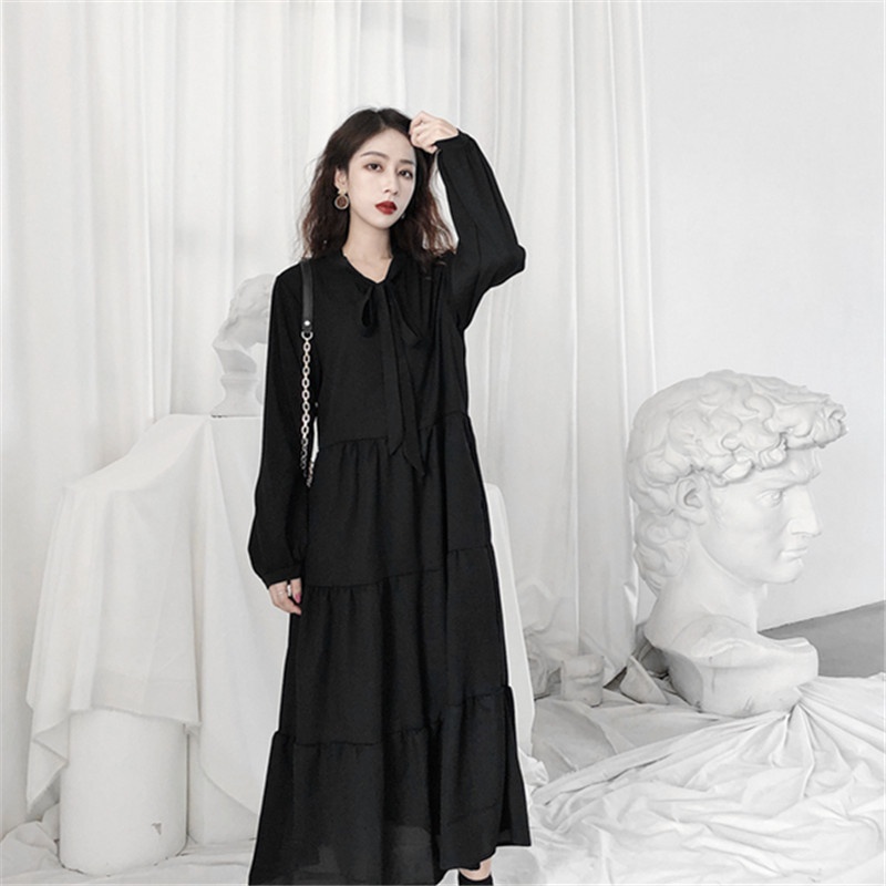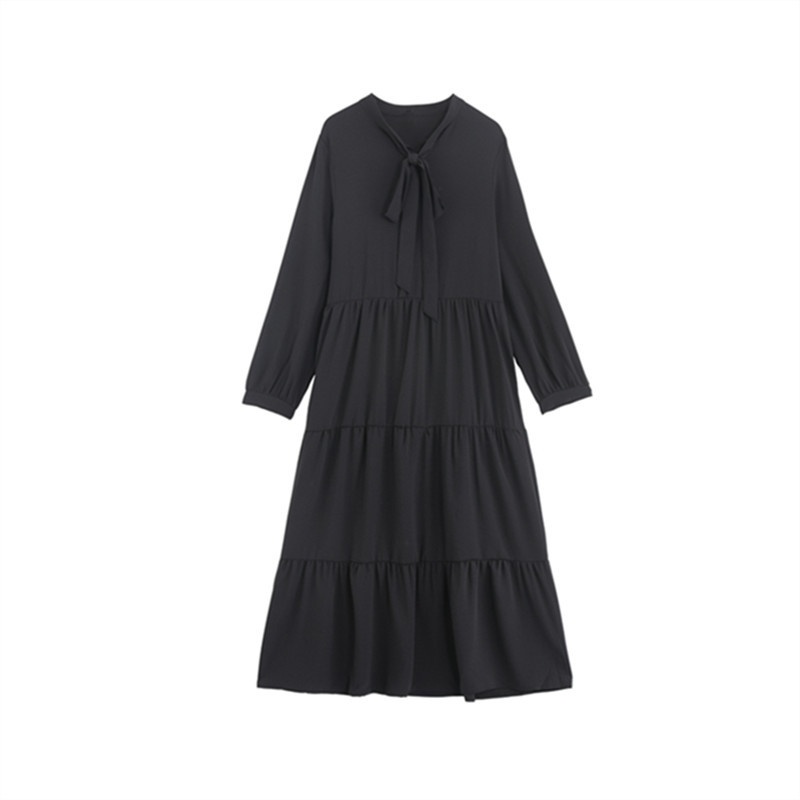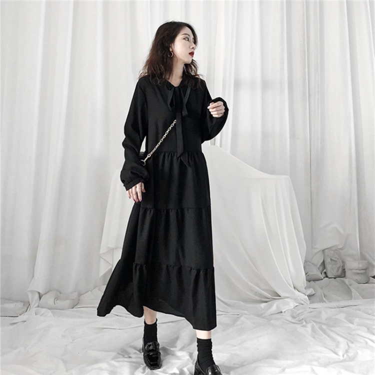法式桔梗裙女春秋宽松气质复古小黑裙温柔风雪纺连衣裙
