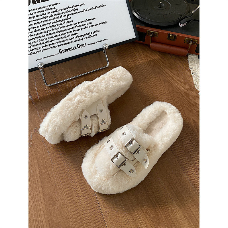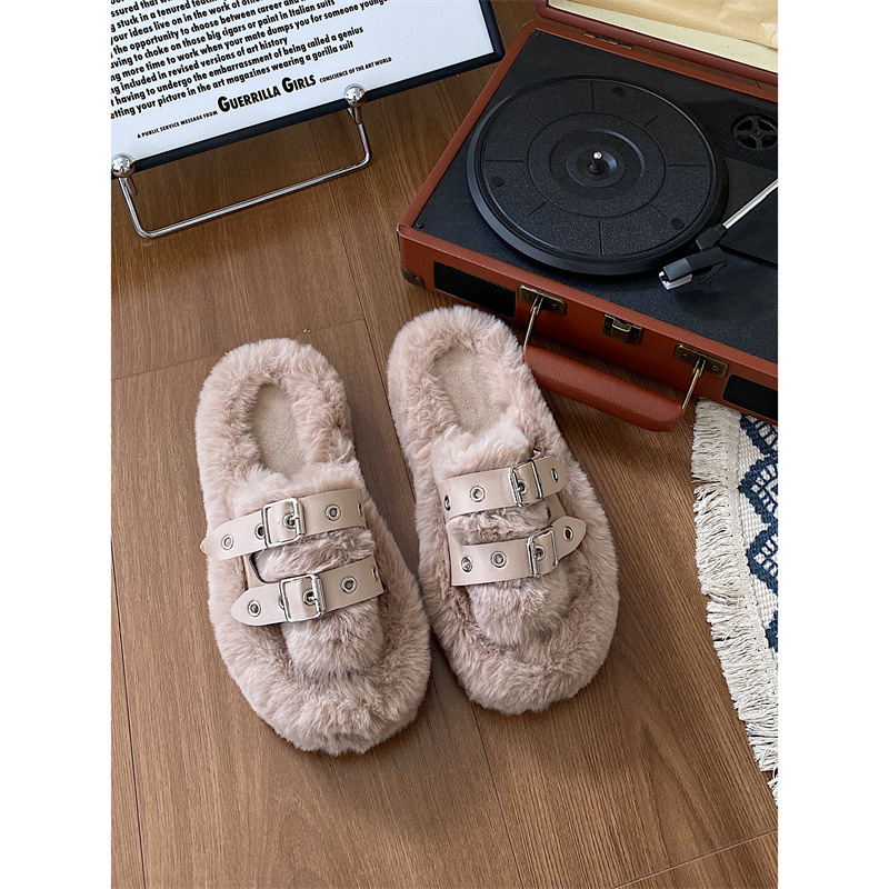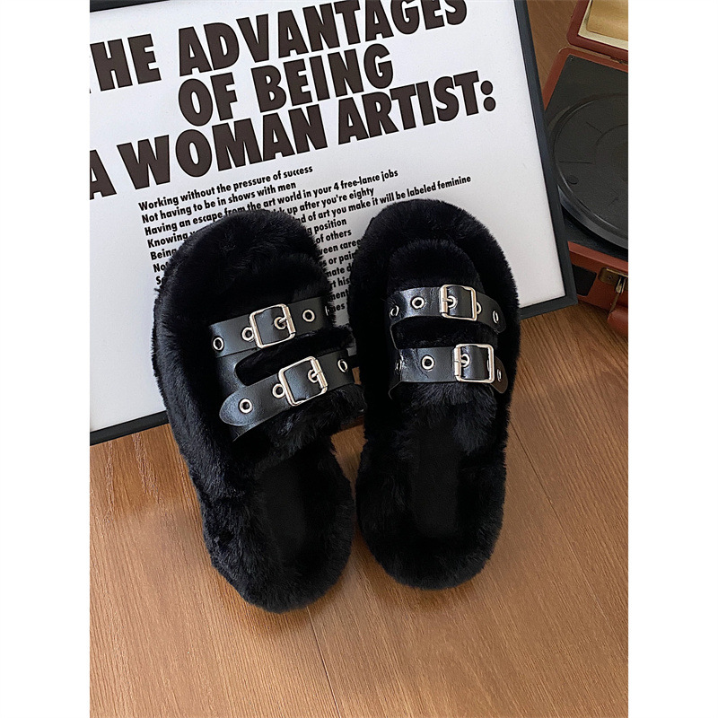 Black Thick-soled Fur Slippers For Women For Summer Outdoor Wear High-end Fashion One-line Net Celebrity Non-slip Slippers