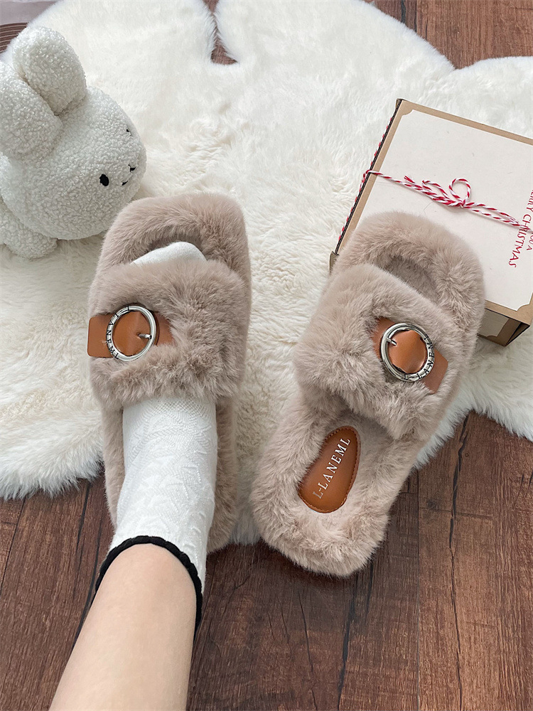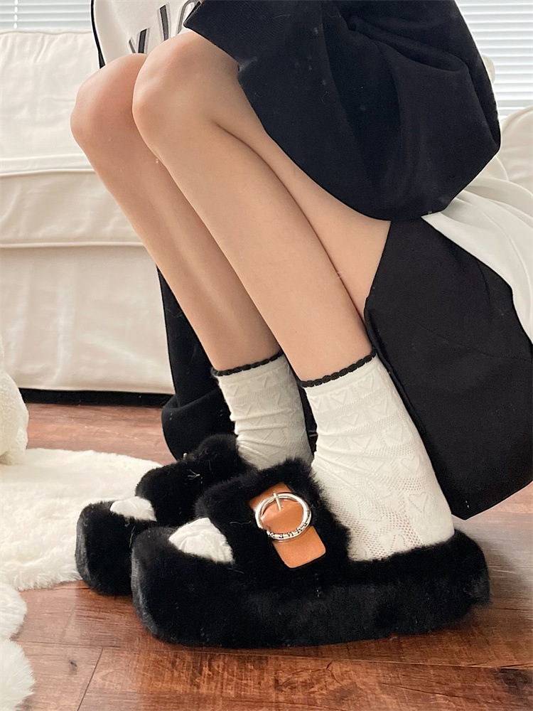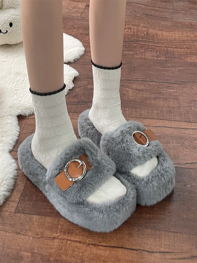 Fashionable Thick-soled Height-enhancing Fur Slippers For Women Early Autumn Styley Outdoor Wear Versatile Comfortable One-line Cotton Slippers