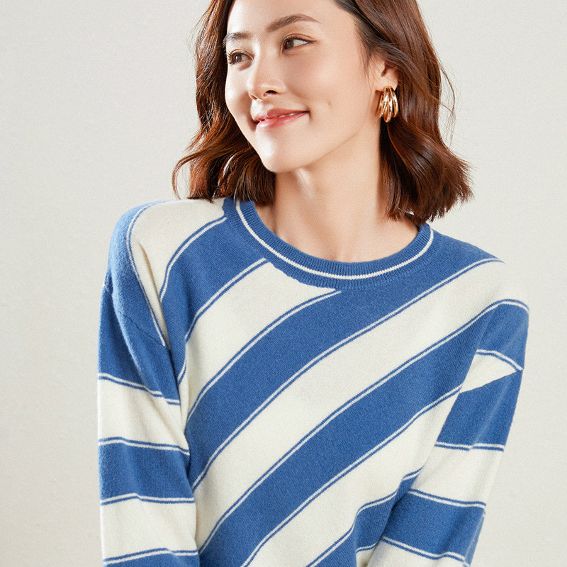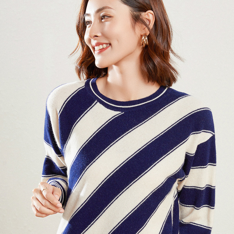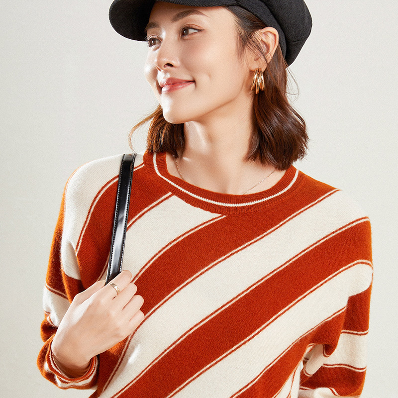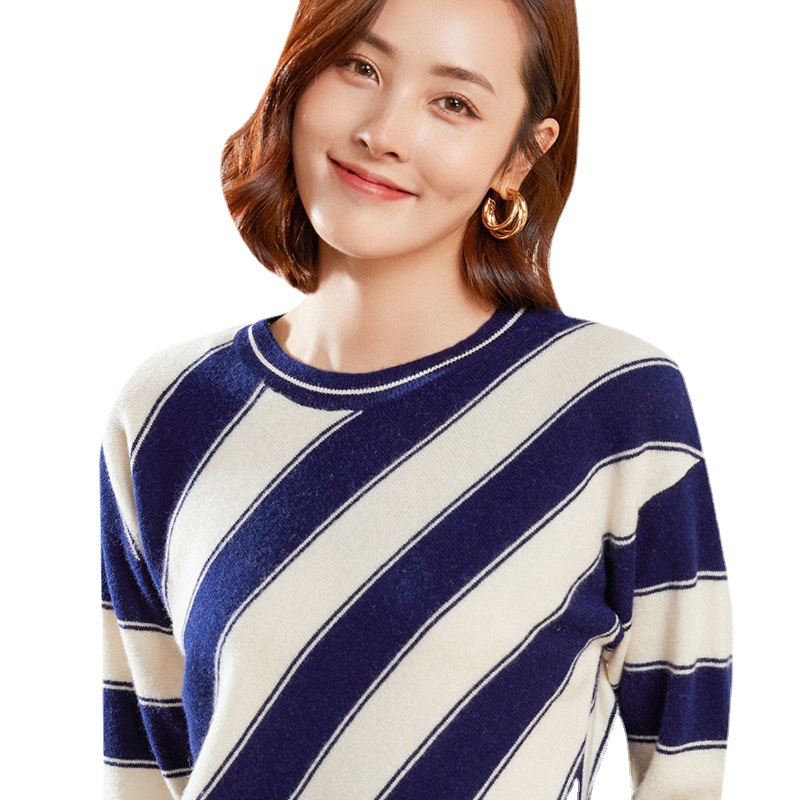 Striped Pure Wool Sweater Women's Round Neck Loose Thickened Knitted Sweater Korean Style Pullover Short Bottom Sweater Long Sleeve